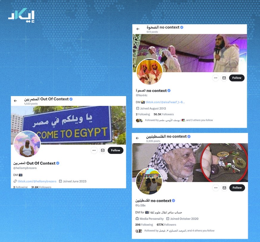 وذكرت "إيكاد" أن هذه الحسابات، وغيرها كثير، تعد جزء من لجان إسرائيلية موسعة، عملت لسنوات على ضرب العرب ببعضهم، وتأجيج الصراعات بين السعوديين والمصريين، والمصريين والفلسطينيين والمغاربة والجزائريين وغيرها، وهاجمت بعد عملية طوفان الأقصى المقاومة الفلسطينية بشراسة، وحاربت العرب وأججت الفتنة، لصالح الاحتلال الإسرائيلي لتصديق رواياته المغلوطة عن المقاومة.