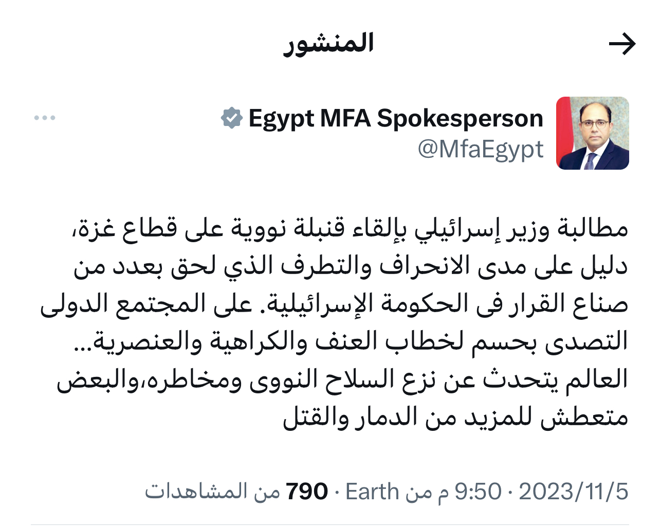 وطالب المجتمع الدولى فى تدوينه له على شبكة أكس، المجتمع الدولى بالتصدى بحسم لخطاب العنف والكراهية والعنصرية.