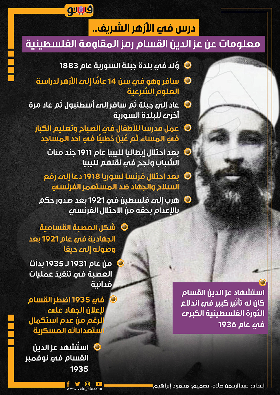 درس في الأزهر الشريف.. معلومات عن عز الدين القسام رمز المقاومة الفلسطينية (انفوجراف) الأربعاء 08/نوفمبر/2023 - 05:10 م 11/8/2023 5:10:38 PM عز الدين القسام، فيتو عبدالرحمن صلاح شارك طباعة 18 حجم الخط شارك طباعة عز الدين القسام طوفان الأقصى عملية طوفان الأقصى جيش الاحتلال المقاومة الفلسطينية كتائب القسام