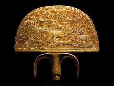 كما عثر بمقبرة الملك توت عنخ آمون علي مروحة من الذهب في اطرافها ثقوب لتثبيت ريش النعام ولها مقبض على شكل زهرة اللوتس وقد نقش عليها احد مغامرات الملك الذهبي توت عنخ آمون وهو يصطاد مستخدما العربة والكلاب المدربة هذا في أحد الوجهين اما الوجهة الاخر فيعود الملك مظفرا بالغنيمة.