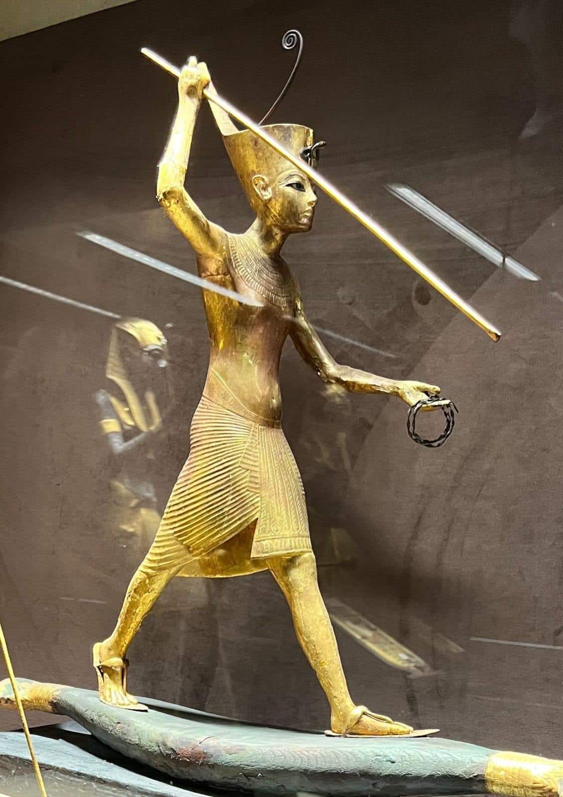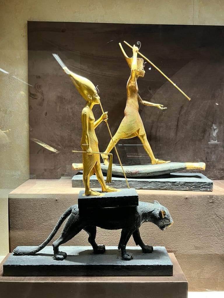 كما يعرض المتحف تمثال الملك توت عنخ آمون في قاربه وهو يهم بتوجيه طعنة بالحربة التي في يمينه الى العدو الأزلي " ست " والذى كان يتجسد عادة في هيئة فرس النهر او التمساح، كما يعرض تمثال من الخشب المذهب للملك توت عنخ آمون وهي قطعة فريدة من آثار الملك توت عنخ آمون تمثل الملك يعتلي فهد من الخشب المغطى باللون الأسود، وعثر عليها داخل مقبرته حيث كان وسيلة أخرى ليَعبر به الملك الشاب ظلام عالم الموتى إلى الخلود، حيث كان الفهد الأسود رمزًا للعالم الآخر وسماء الليل له عينان من الذهب تمكنانه من الرؤية في الظلام.