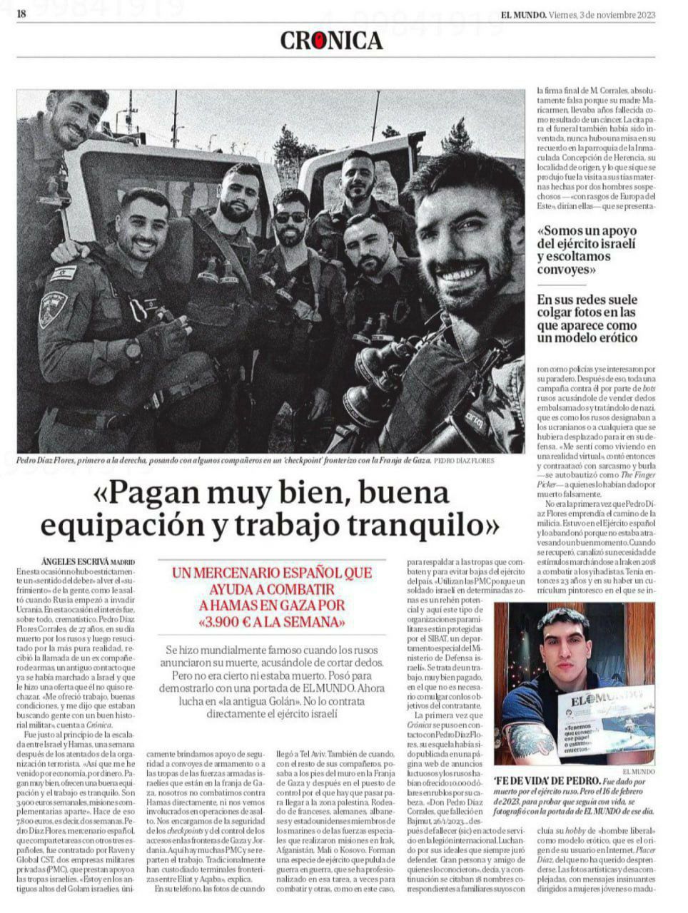 كما نشر بيدور دياز، المرتزق الإسباني، صورًا له مع بعض جنود الاحتلال الإسرائيلي، الأمر الذي دفع صحيفة "إلموندو"، الإسبانية، لإجراء اللقاء معه، ليكشف بيدور سبب قدومه للقتال في صفوف قوات الاحتلال قائلًا: "إنهم يدفعون بشكل جيّد للغاية".