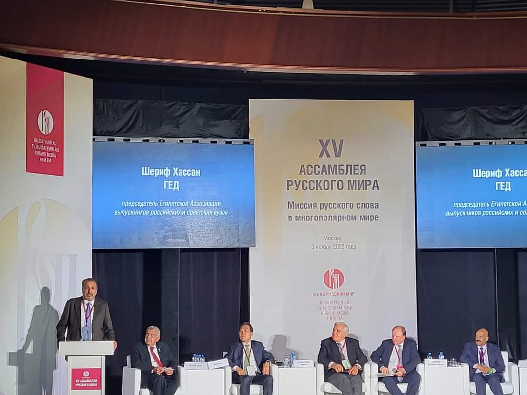 وجاءت كلمة مصر التي ألقاها كل من شريف جاد رئيس الجمعية المصرية لخريجي الجامعات الروسية والسوفيتية والدكتور محمد نصر الجبالي عميد كلية الألسن بجامعة الأقصر.