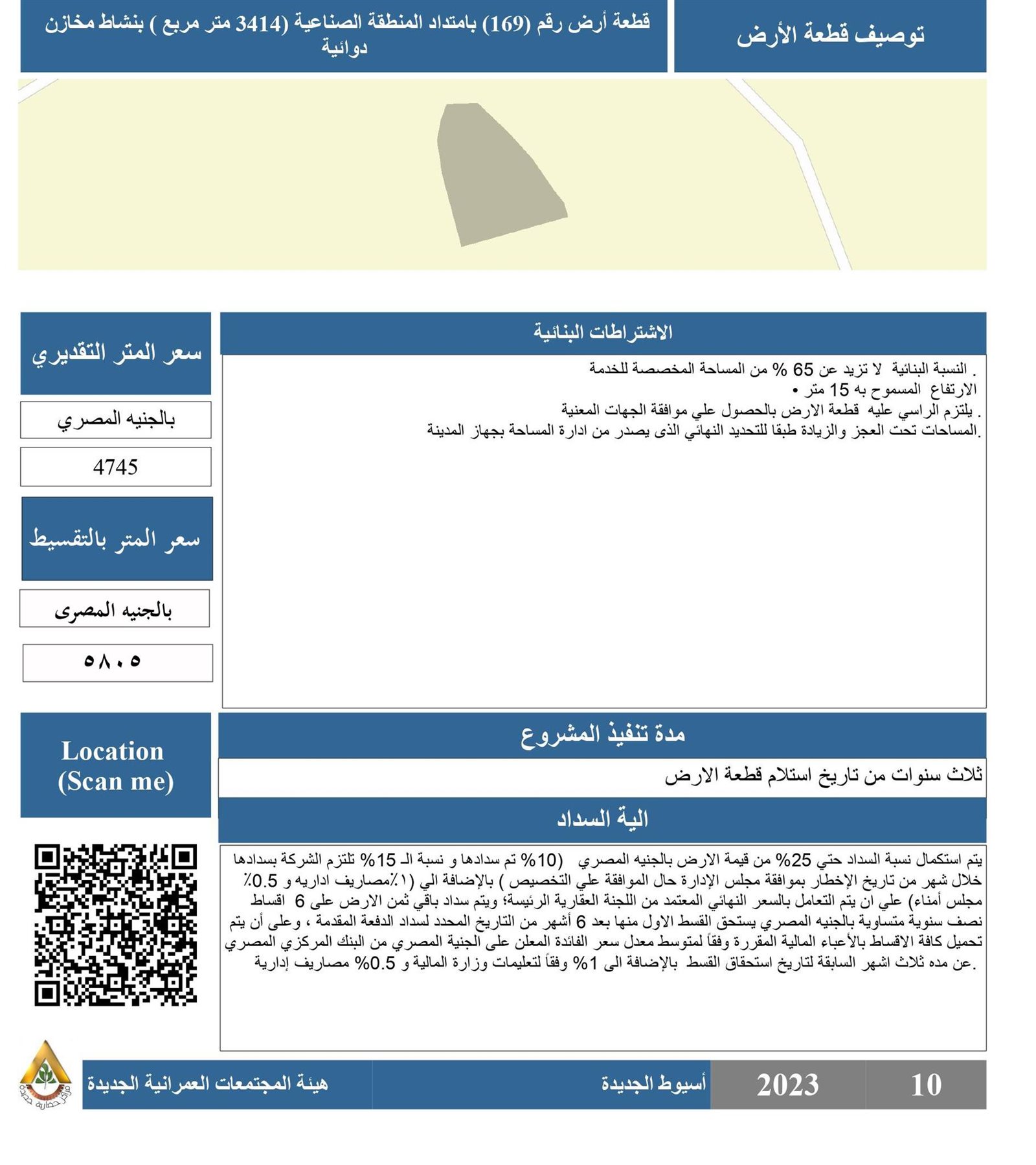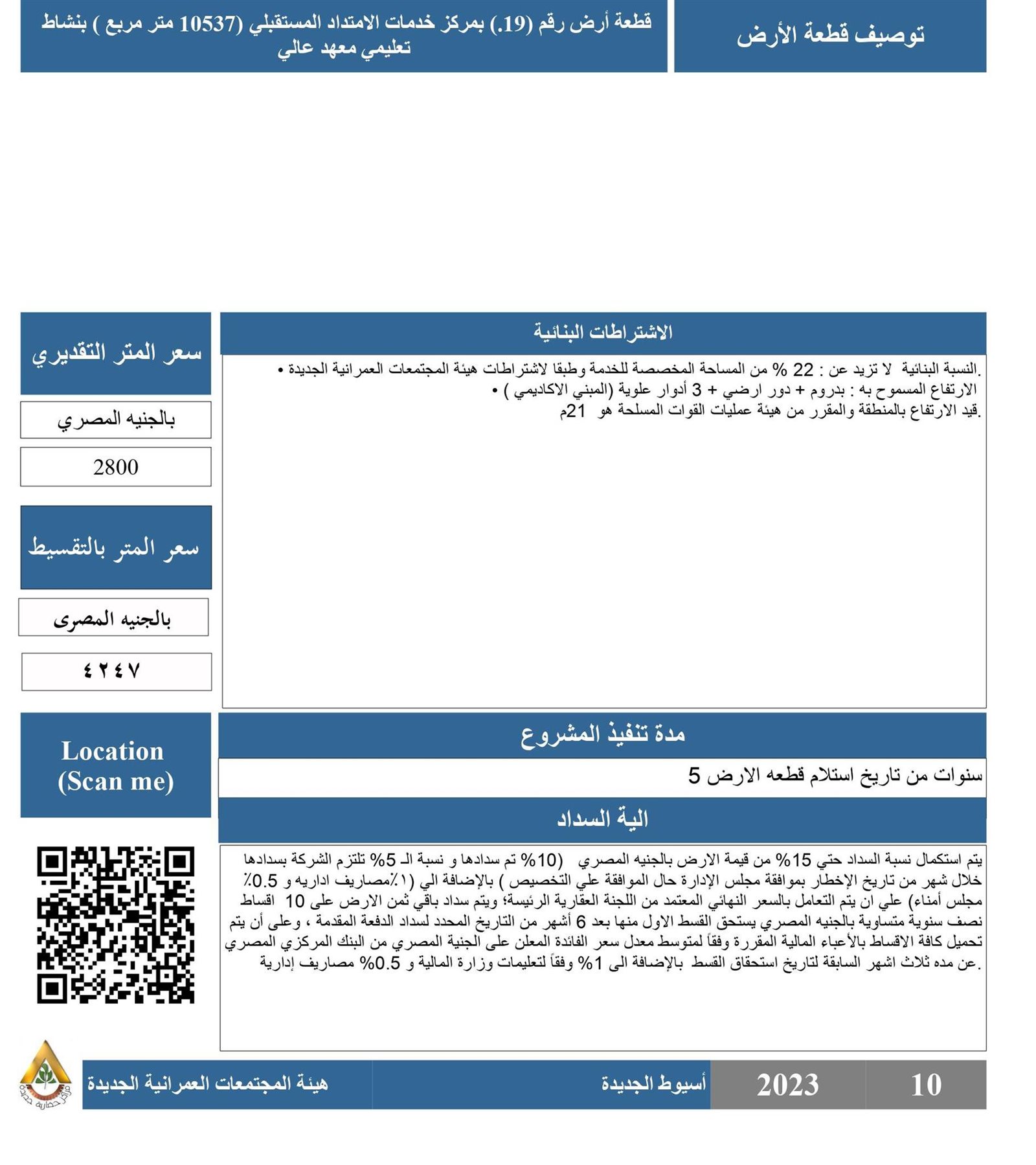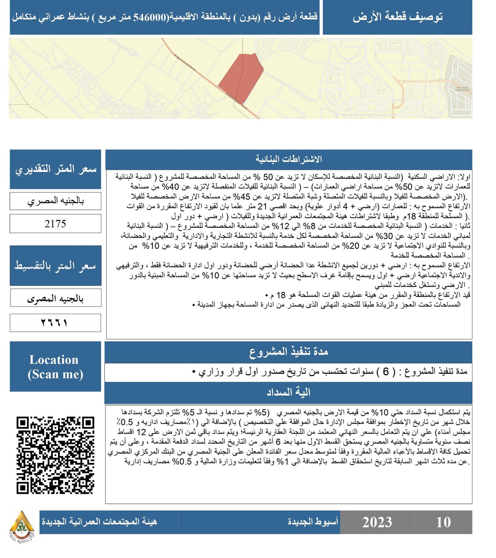 وتطرح بمدينة أسيوط الجديدة أرض مخازن ادوية بمساحة 3414 متر بسعر 4.7 ألف جنيه، وأرض تعليمي بمساحة 10537 متر بسعر 2.8 ألف جنيه، وأرض عمراني متكامل بمساحة 546000 متر بسعر 2.1 ألف جنيه.