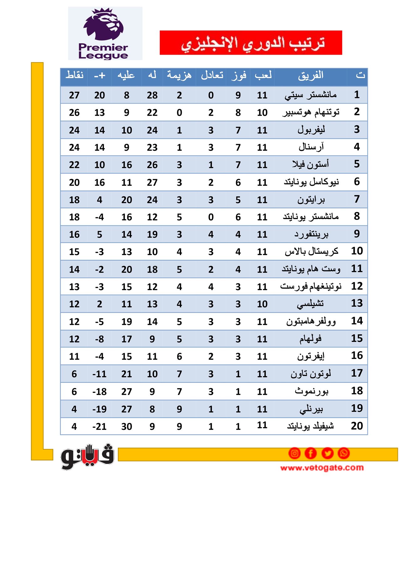 جدول ترتيب الدوري الانجليزي