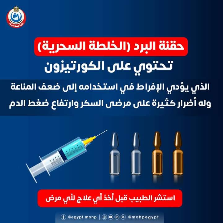 وأكدت وزارة الصحة في منشور توعوي اليوم، أن حقن البرد المنتشرة في الصيدليات تحتوي على مضاد حيوي وكورتيزون وتسبب مضاعفات خطيرة على المواطنين.