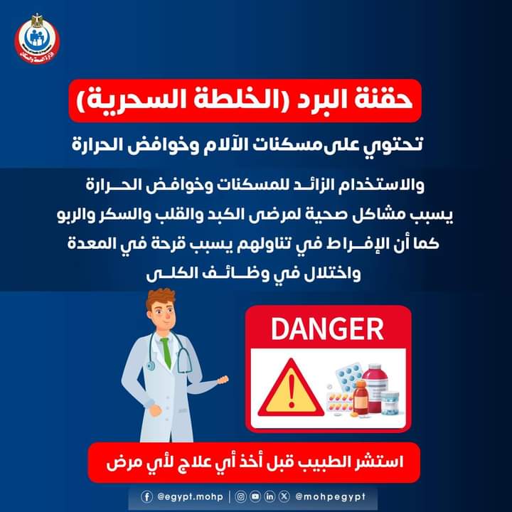 جددت وزارة الصحة والسكان تحذيرها من قيام البعض بالحصول على حقنه البرد أو المعروفة بالخلطة الشعبية عند الإصابة بنزلات البرد والأنفلونزا.