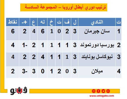 ترتيب المجموعة السادسة في دوري أبطال أوروبا