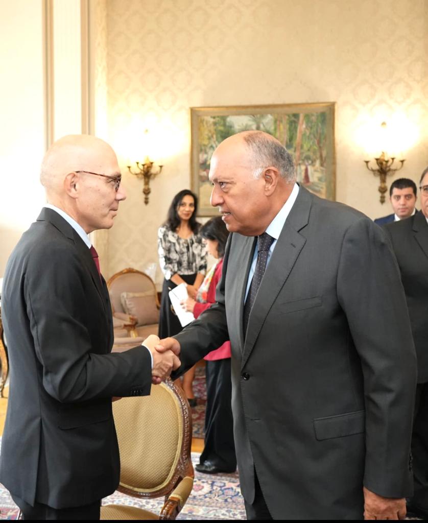 وذكر المتحدث باسم الخارجية، أن المسئول الأممي حرص خلال الاجتماع على الاستماع إلى تقييم سامح شكري لتطورات التصعيد العسكري الإسرائيلي غير المسبوق في قطاع غزة، والتعرف على الرؤية والتحركات المصرية على مسار تحقيق الوصول إلى وقف لإطلاق النار، وإيصال المساعدات اللازمة لسكان قطاع غزة، حيث أكد الوزير شكري على أن الصدمة الإنسانية التي يستشعرها الجميع جراء القصف الإسرائيلي المستمر للمنشآت المدنية وسياسات العقاب الجماعي من حصار وتهجير، تحتم على الأطراف الدولية الاضطلاع بمسئولياتها القانونية والإنسانية والسياسية تجاه إنهاء هذه الكارثة والتحرك الجاد لدعم وقف إطلاق النار في أقرب وقت.
