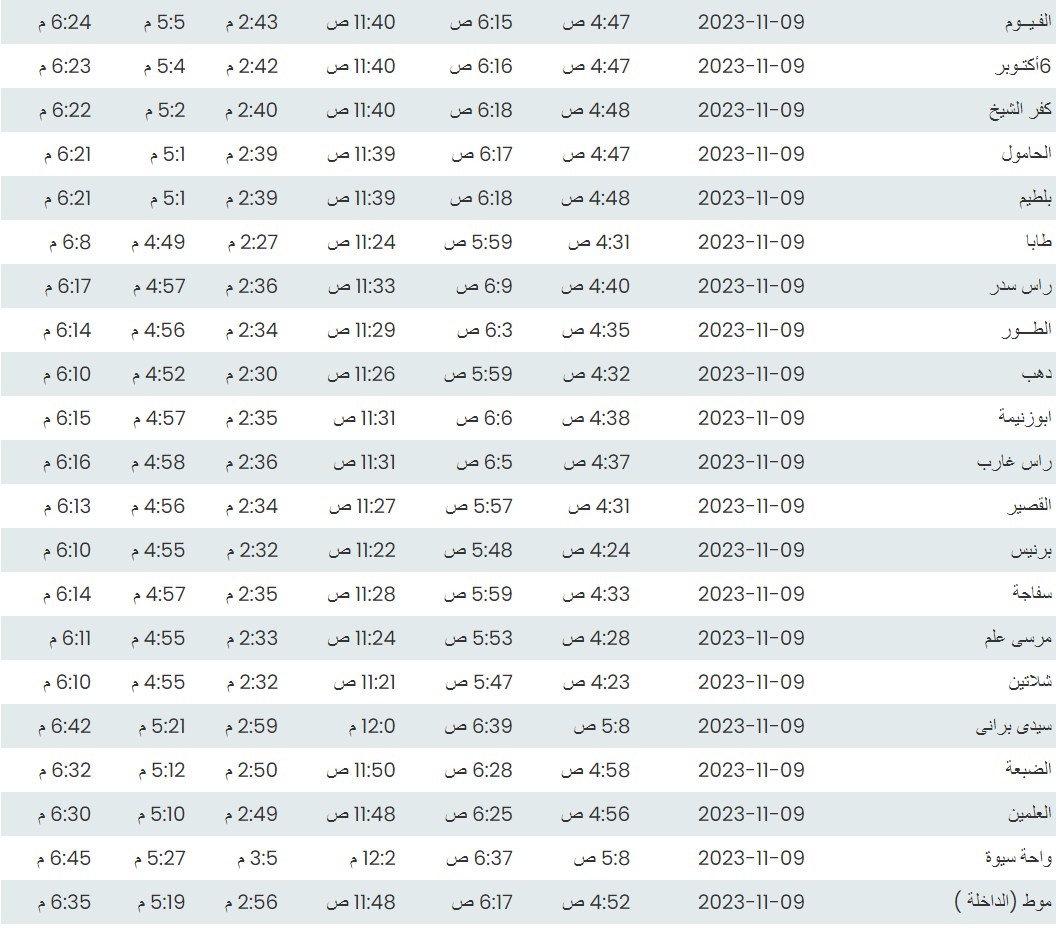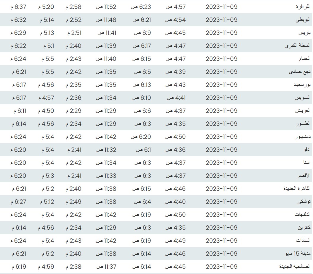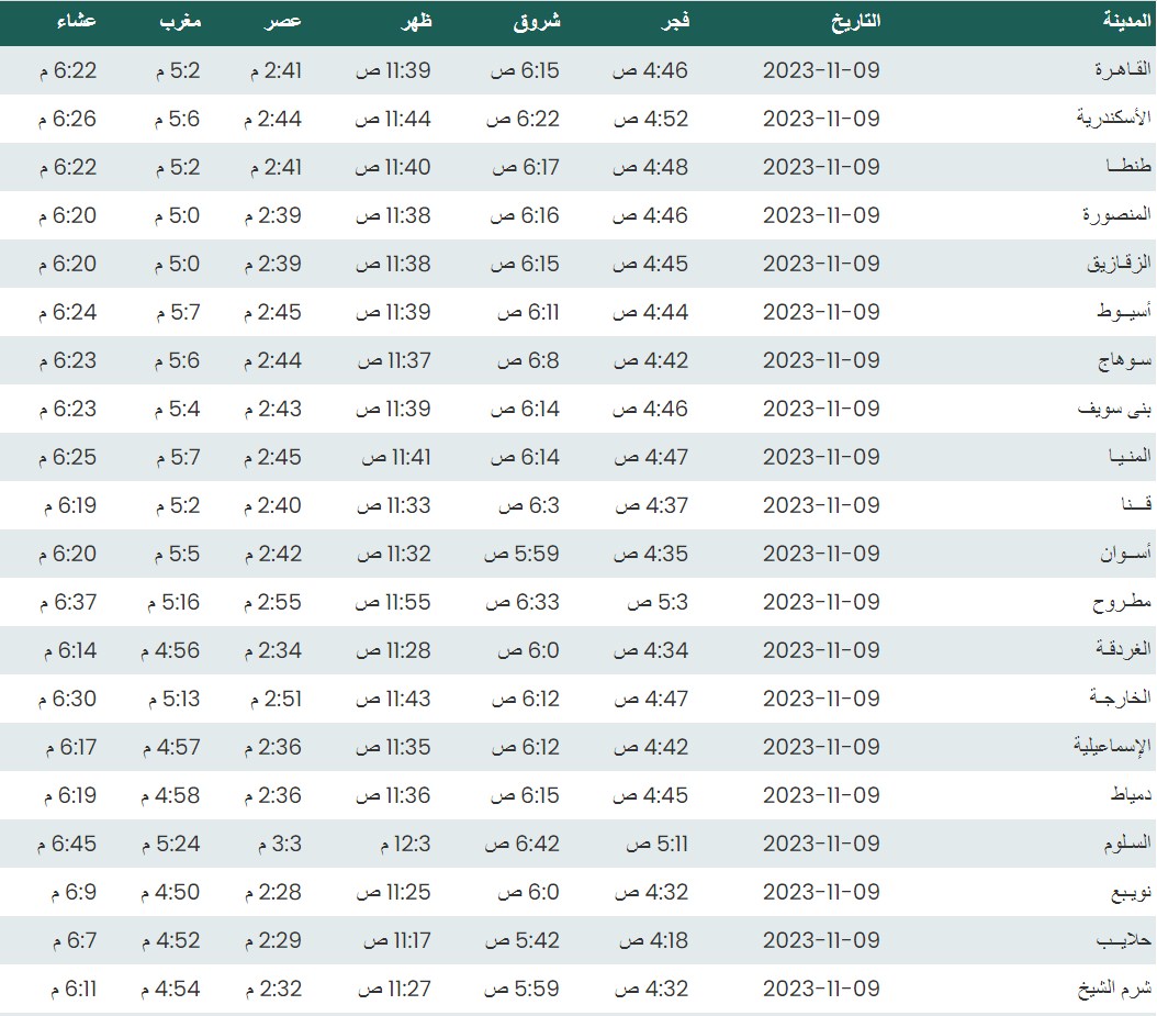 مواقيت الصلاة اليوم وفقًا للتوقيت المحلي لمدينتي القاهرة والإسكندرية وكذلك،مواقيت الصلاة، لعدد من مدن ومحافظات الجمهورية من واقع بيانات الهيئة العامة للمساحة