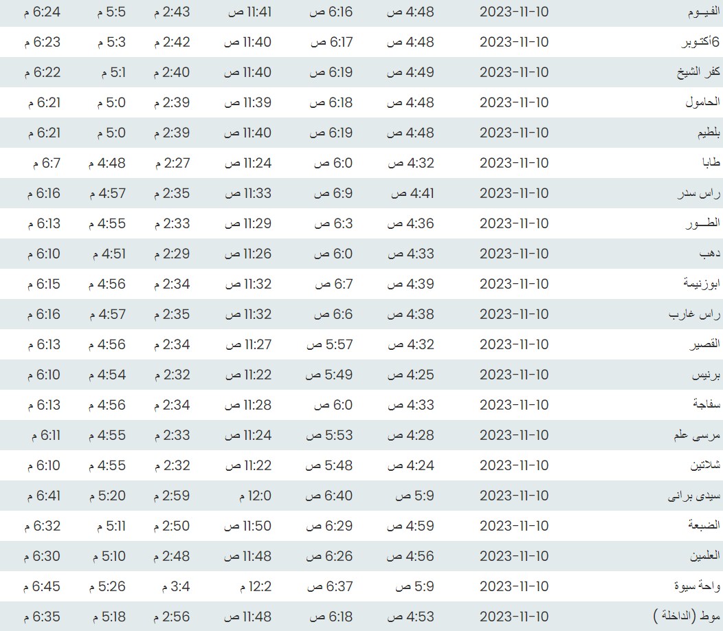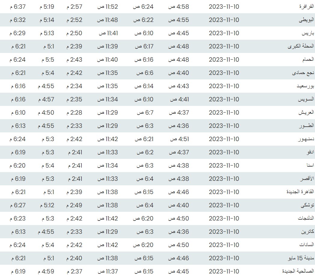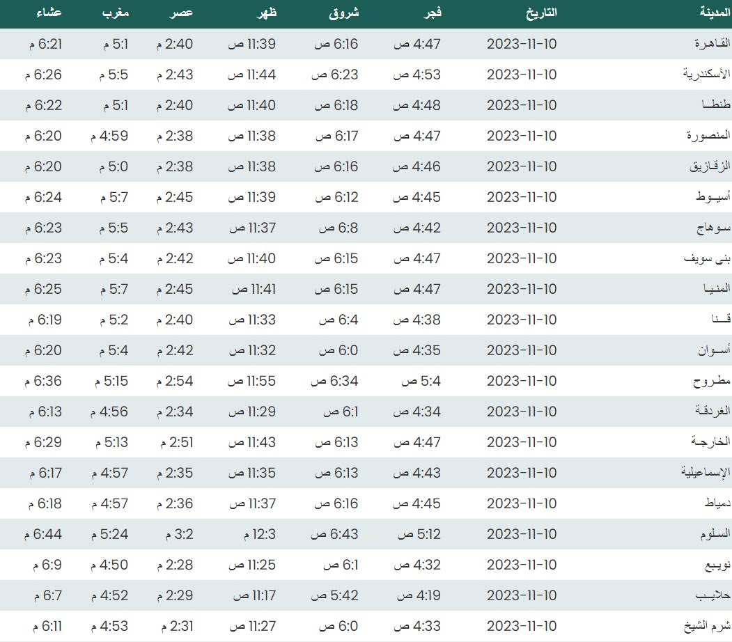 مواقيت الصلاة اليوم وفقًا للتوقيت المحلي لمدينتي القاهرة والإسكندرية وكذلك،مواقيت الصلاة، لعدد من مدن ومحافظات الجمهورية من واقع بيانات الهيئة العامة للمساحة
