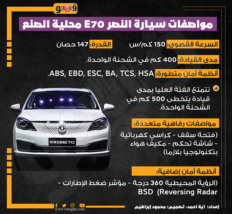 مواصفات سيارة النصر E70 محلية الصنع (انفوجراف) السبت 11/نوفمبر/2023 - 03:36 م 11/11/2023 3:36:07 PM سيارات نصر، فيتو آية أحمد شارك طباعة 18 حجم الخط شارك طباعة سيارة النصر سرعة قصوى مواصفات الاطارات الشحنة تكنولوجيا