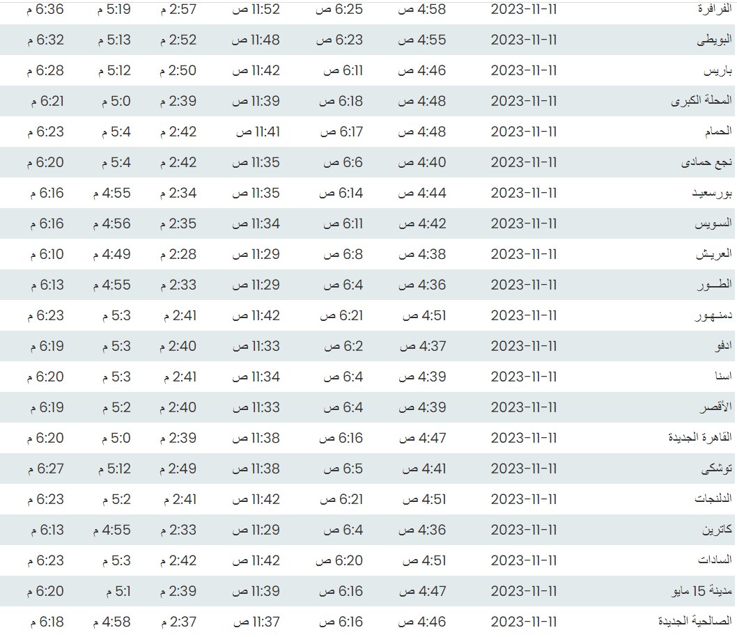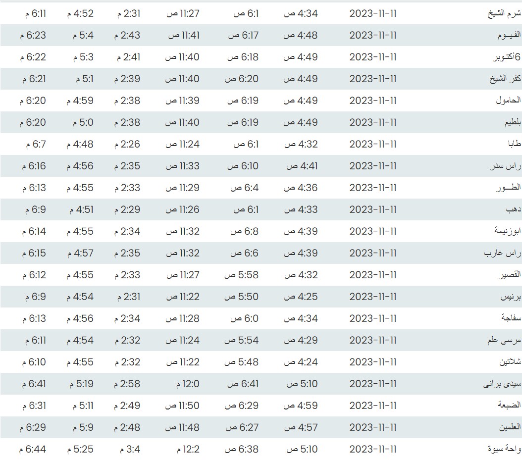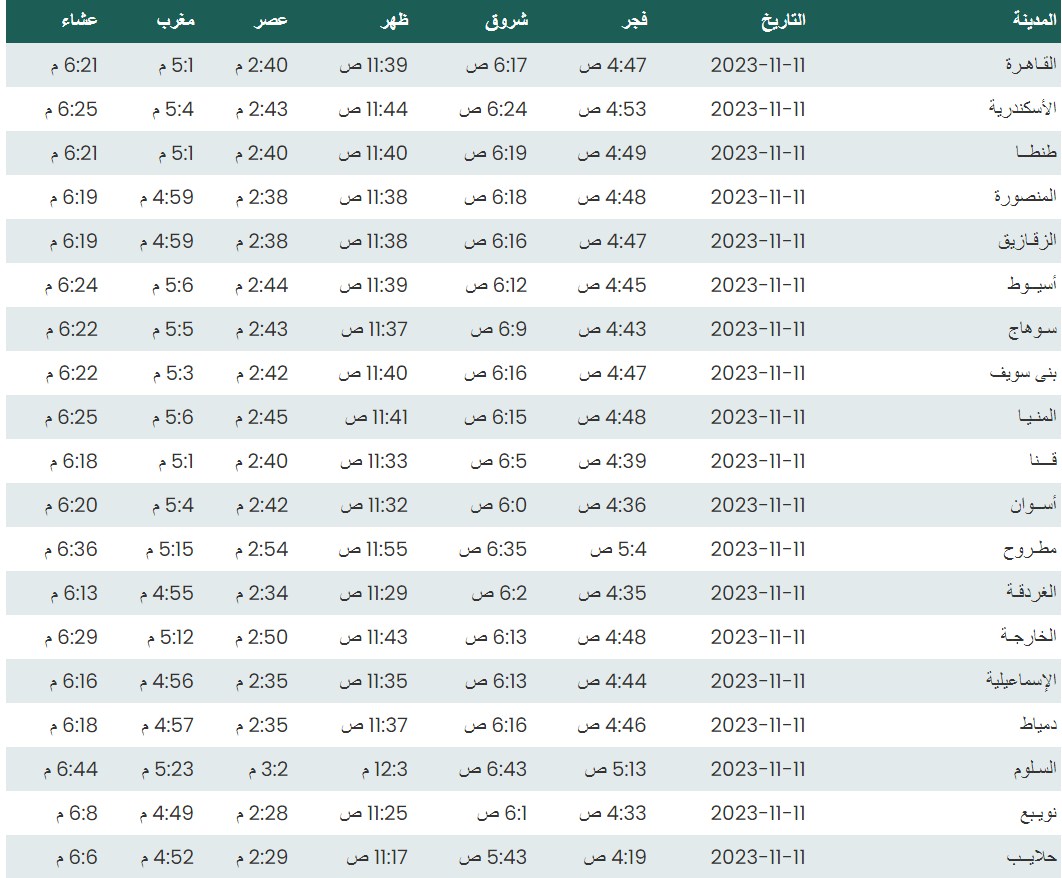 مواقيت الصلاة اليوم وفقًا للتوقيت المحلي لمدينتي القاهرة والإسكندرية وكذلك،مواقيت الصلاة، لعدد من مدن ومحافظات الجمهورية من واقع بيانات الهيئة العامة للمساحة