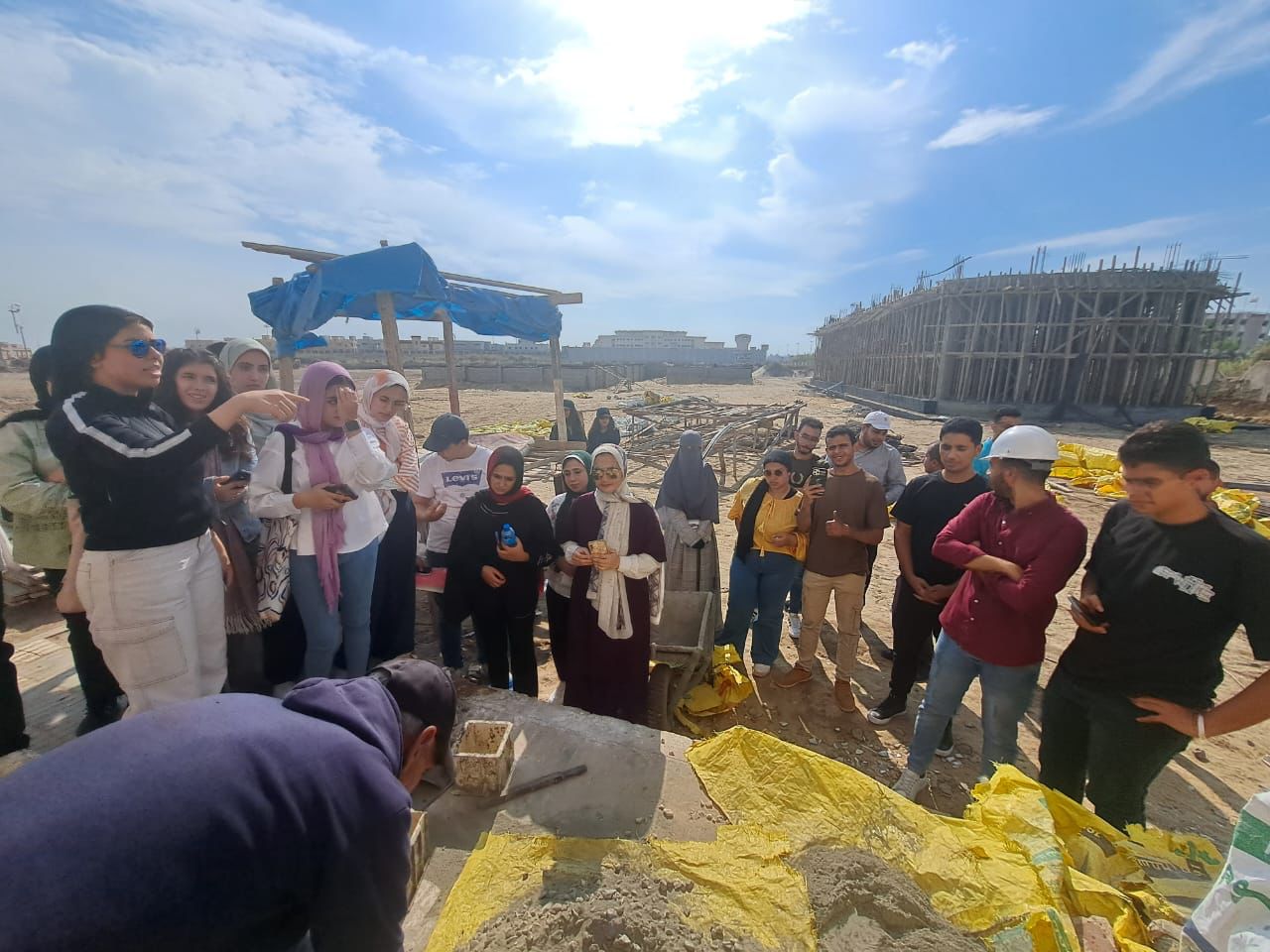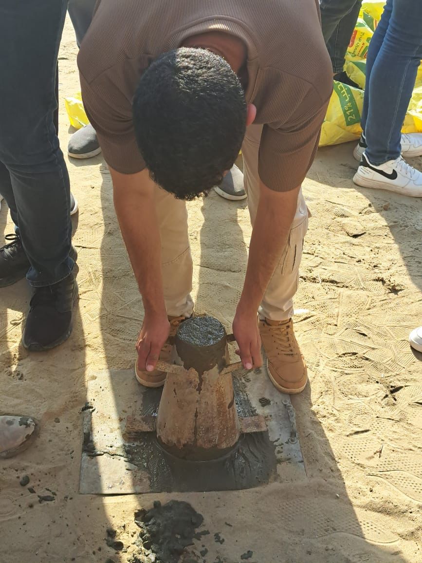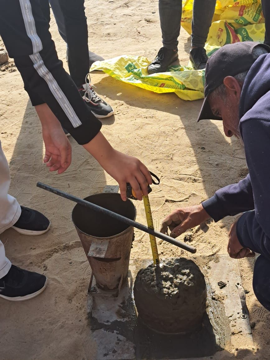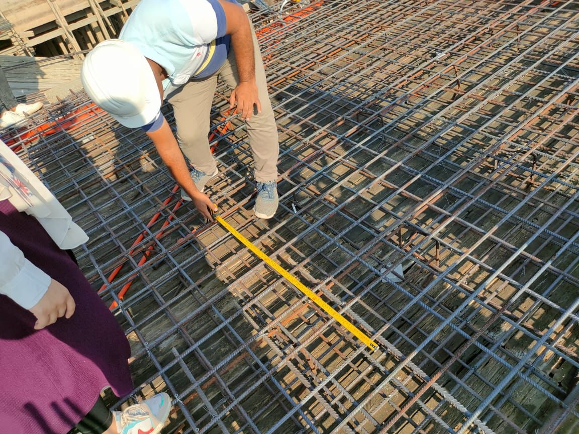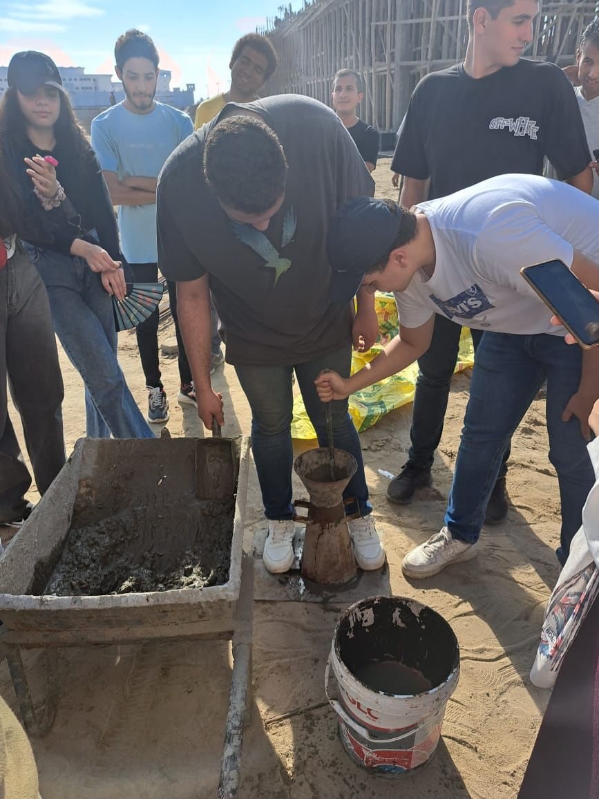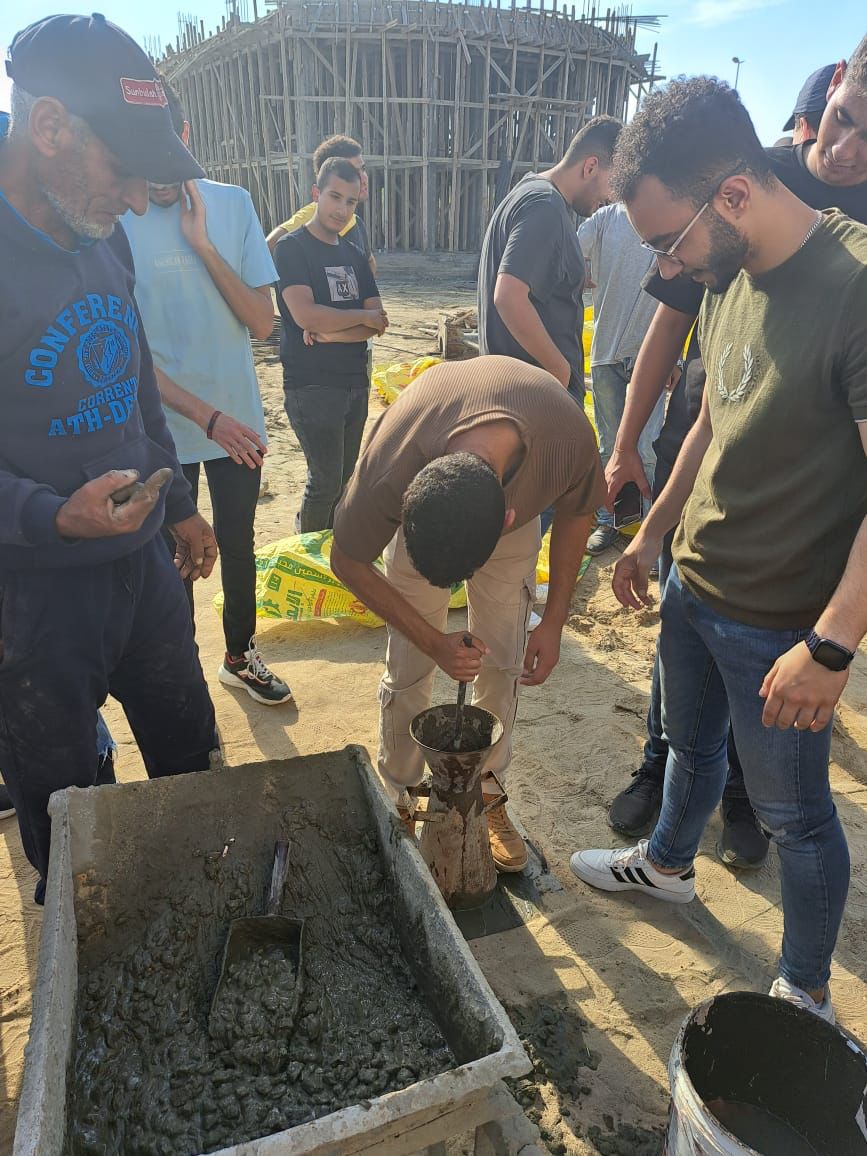 وقام الطلاب بالتعرف على الموقع وتدريبهم على كيفية عمل اختبارات فعلية على الخلطات الخرسانية في الموقع لمعرفة خصائصها والوقوف على مدى ملائمتها لأغراض البناء هذا بالإضافة للتعرف على طريقة قراءة اللوحات الإنشائية التنفيذية ومتابعة خطوات تنفيذ واستلام أعمال حديد التسليح وأعمال العزل والتمديدات الصحية والكهربائية لحمام السباحة والمباني الملحقة، ومطابقتها باللوحات التنفيذية، والتعرف على آليات المتابعة الدورية لها.