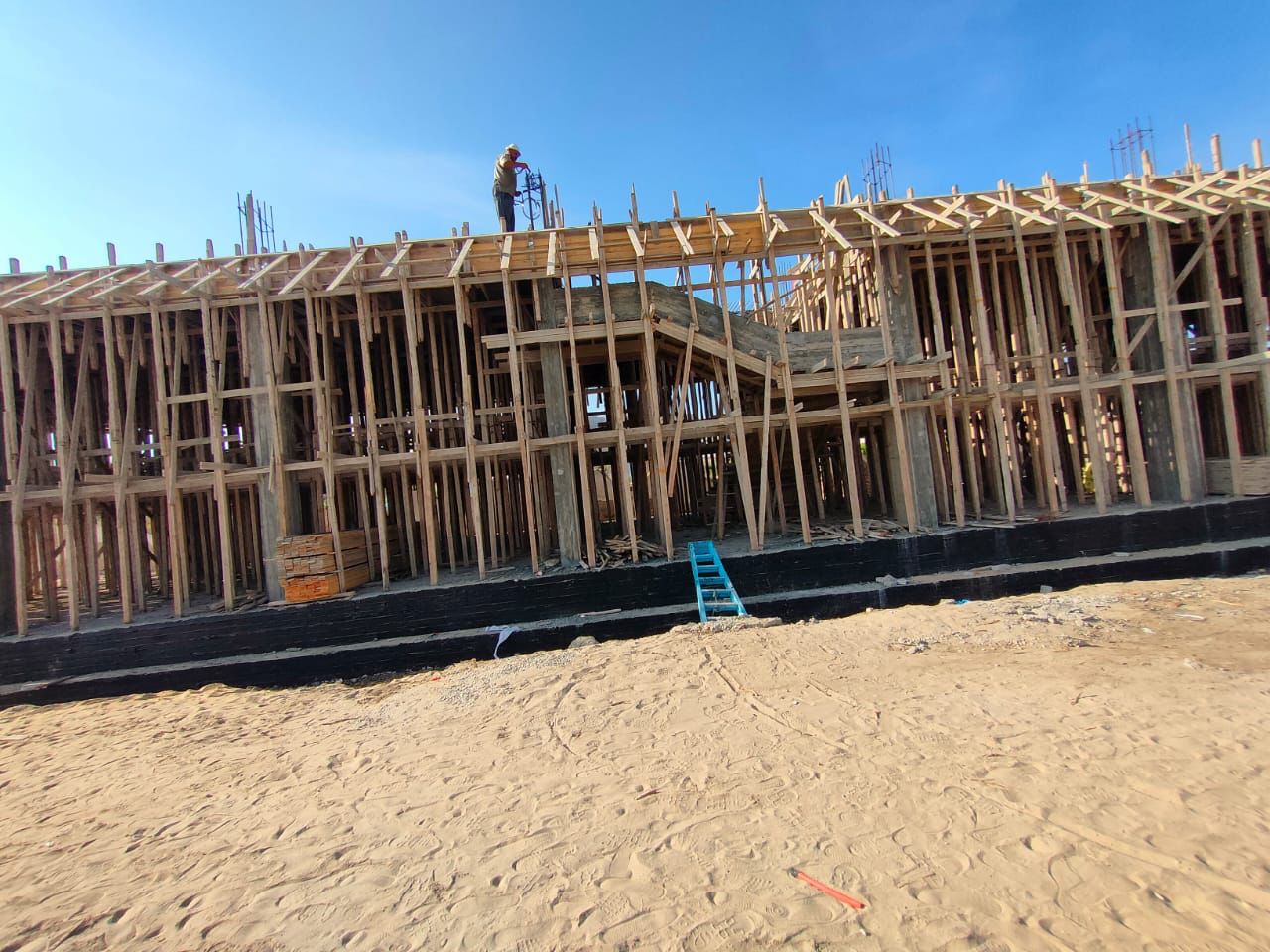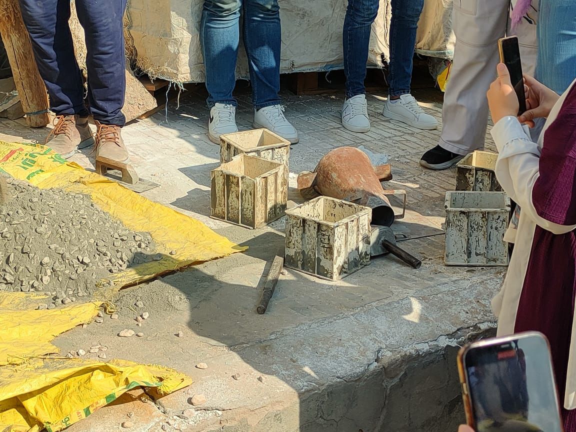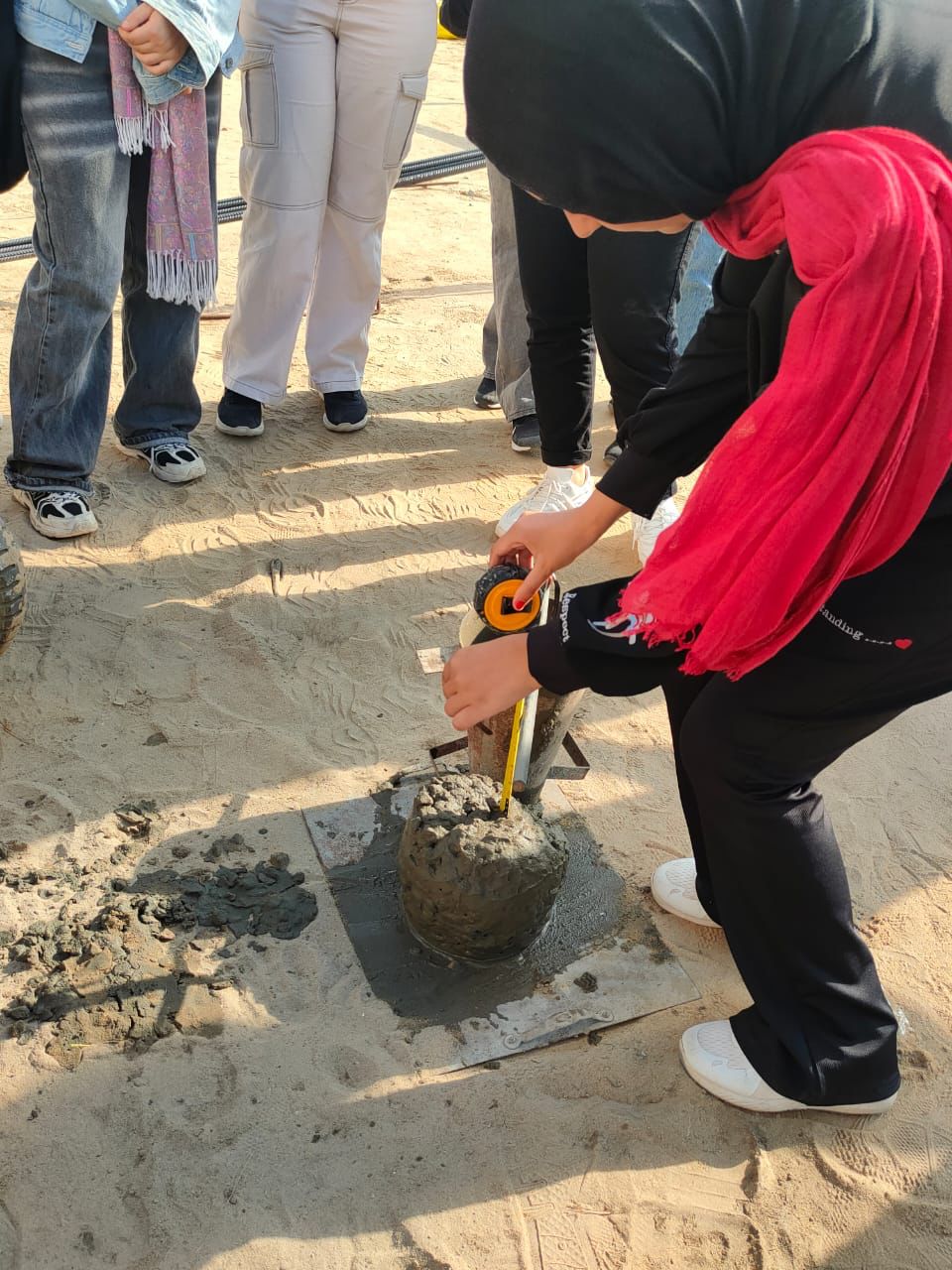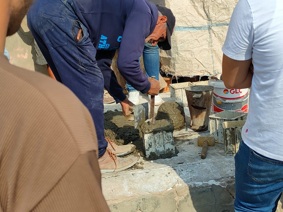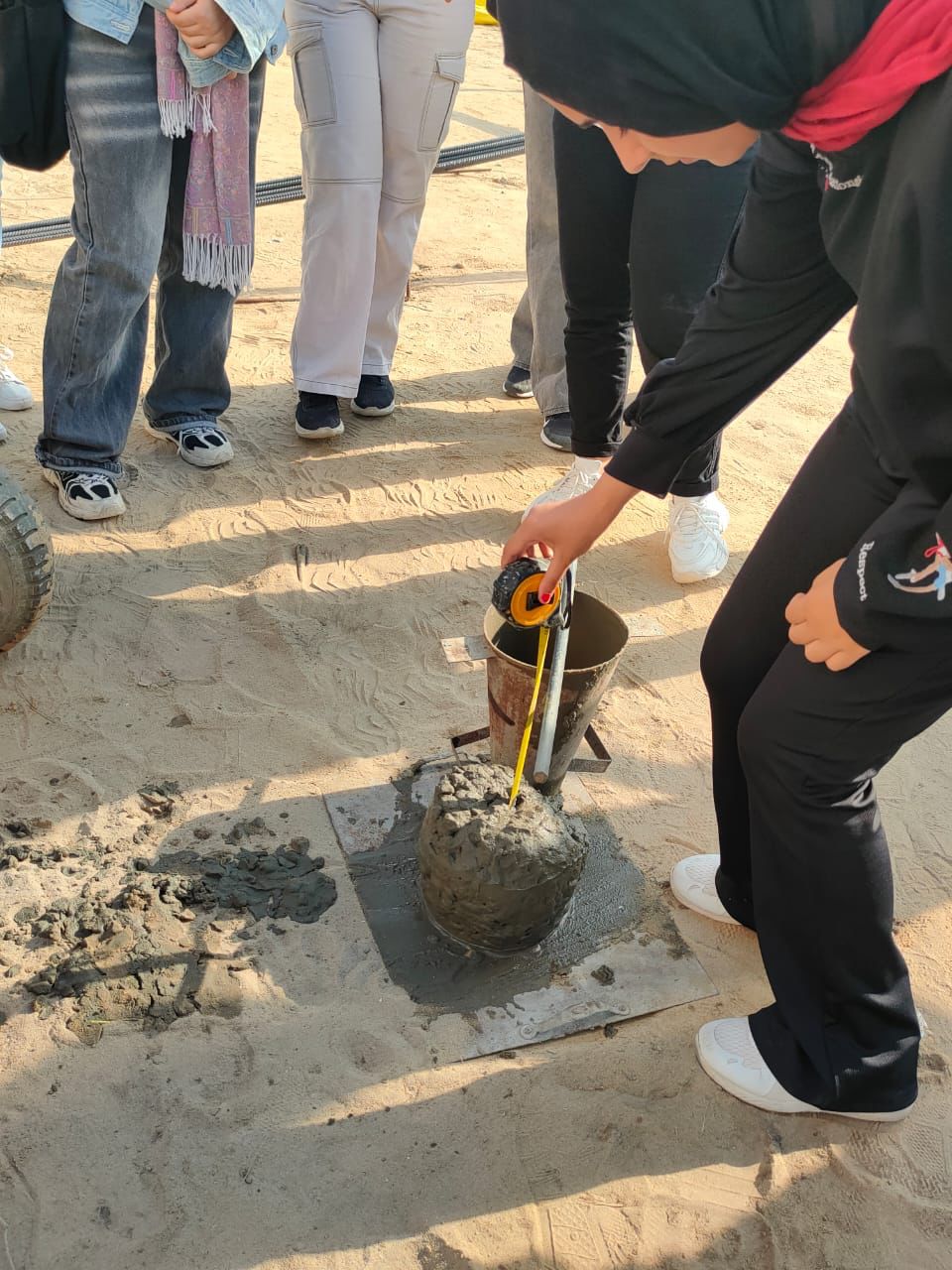 وقام الطلاب بالتعرف على الموقع وتدريبهم على كيفية عمل اختبارات فعلية على الخلطات الخرسانية في الموقع لمعرفة خصائصها والوقوف على مدى ملائمتها لأغراض البناء هذا بالإضافة للتعرف على طريقة قراءة اللوحات الإنشائية التنفيذية ومتابعة خطوات تنفيذ واستلام أعمال حديد التسليح وأعمال العزل والتمديدات الصحية والكهربائية لحمام السباحة والمباني الملحقة، ومطابقتها باللوحات التنفيذية، والتعرف على آليات المتابعة الدورية لها.