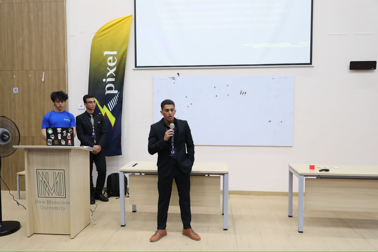 جاء ذلك تحت رعاية وحضور الدكتور معوض الخولي رئيس جامعة المنصورة الجديدة، وإشراف الدكتور إبراهيم فتحى معوض عميد كلية علوم وهندسة الحاسب والدكتور خالد فؤاد مدير البرامج بالكلية قدم نادى xpixel بقيادة رائدها الدكتورة سارة المولى ومشاركة الدكتور عمر الزكي في التنظيم والتنفيذ ورشه عمل متميزة بعنوان The Oracle of the 21st Century، وبحضور أعضاء هيئة التدريس ومعاونيهم وطلاب الكلية، قدم فريق النادي الورشة لزملائهم الطلاب ضمن إطار المشاركة الفعالة فى تبادل الخبرات فيما بينهم تنفيذا لخطط ورؤية الجامعة فى تطوير الطلاب واستخدام الأدوات الذكية والحديثة وتمحورت الورشة حول توظيف واستخدام نماذج الذكاء الاصطناعى المختلفة لمعالجة اللغات الطبيعية حيث بدأت الورشة بكلمة السيد عميد الكليه وقام بعرض تاريخ تأسيس النادى والتذكير برؤية ورسالة الكلية وتناول الخطط المستقبليه والخطوات الجادة للتحقيق.