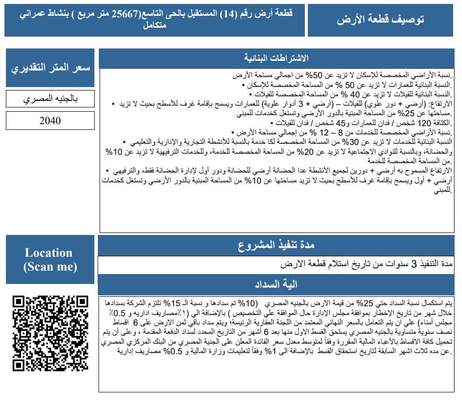 وقال الدكتور عاصم الجزار: فى مدينة القاهرة الجديدة، تم تخصيص 27 قطعة أرض، بأنشطة (عمرانى متكامل – عمرانى مختلط – ترفيهى وحدائق – صناعى – تجارى إدارى – تجارى سكنى – مدرسة – محطة خدمة وتموين سيارات – طبي – مخزن)، وفى مدينة العاشر من رمضان، تم تخصيص 12 قطعة أرض، بأنشطة (تجارى إدارى سكنى – تعليمي – صناعى – تجارى إدارى – حوشة زراعية – محطة خدمة وتموين سيارات – مجمع ورش)، وفى مدينة 6 أكتوبر، تم تخصيص قطعة أرض، بنشاط (عمرانى متكامل)، وفى مدينة بدر، تم تخصيص 7 قطع أراضٍ، بأنشطة (تجارى إدارى – تجارى – سكنى مختلط).