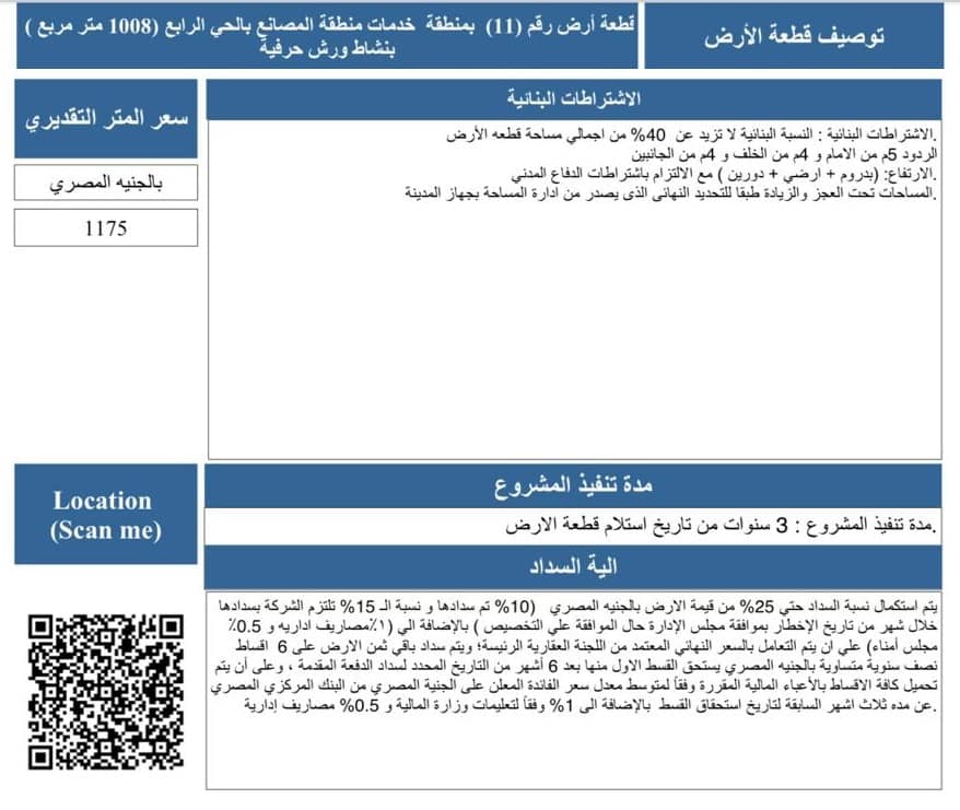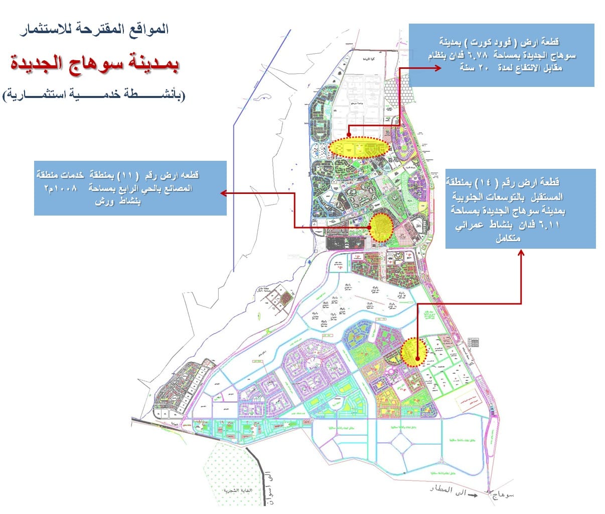 وتطرح بمدينة سوهاج الجديدة أرضًا تعليمية بمساحة 9534 مترا بسعر 13 ألف جنيه، وأرضا عمرانية بمساحة 25667 مترا بسعر ألفي جنيه للمتر، وأرضا ورش حرفية بمساحة 1008 أمتار بسعر ألف جنيه للمتر، وأرض حق انتفاع بمساحة 28476 مترا.