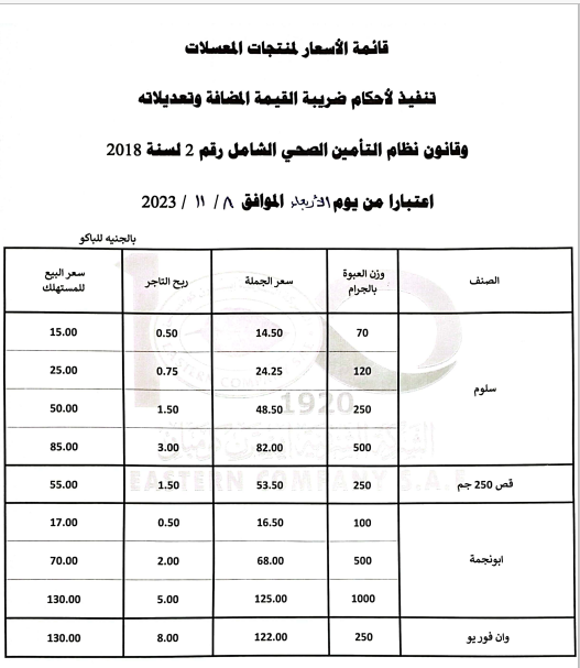 أعلنت الشركة الشرقية للدخان، قائمة الأسعار الجديدة لمنتجات المعسل لها، وذلك تنفيذا لأحكام ضريبة القيمة المضافة وتعديلاته وقانون نظام التأمين الصحي الشامل رقم 2 لسنة 2018 اعتبارًا من اليوم الأربعاء الموافق 8 نوفمبر 2023.