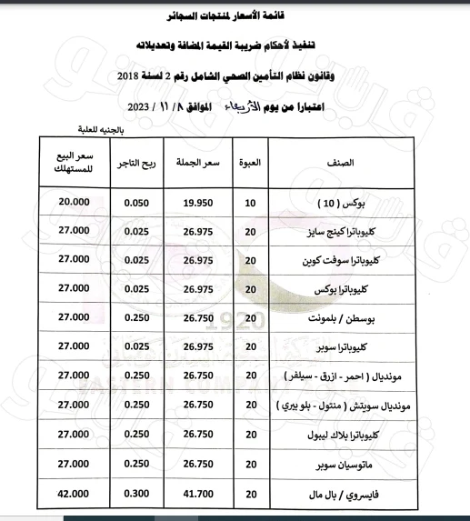 جاءت قائمة السجائر المقرر زيادة سعرها اليوم التي حصلت على فـيتو نسخة منها كالتالي: