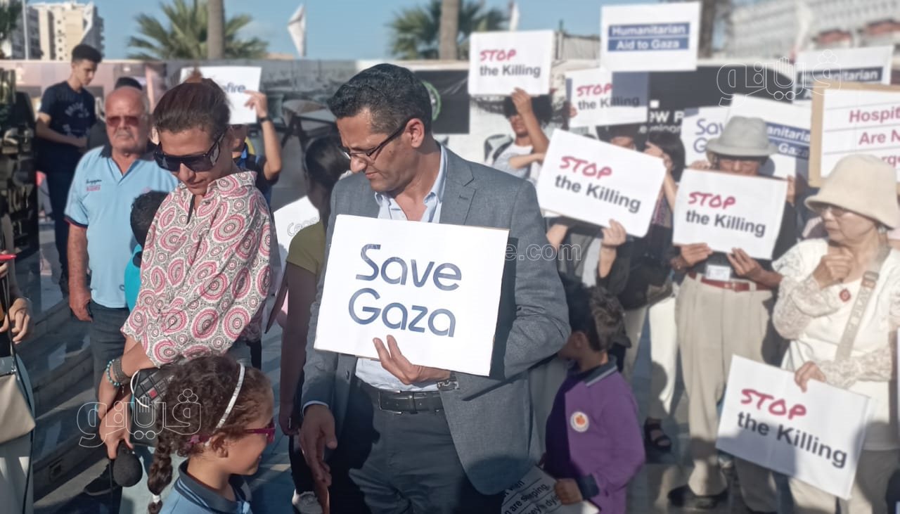 ونظم السائحون وقفه في ساحة سلام مصر بالقرب من الميناء السياحي رفعوا خلالها لافتات رافضين خلالها العدوان علي غزة واستهداف المدنيين والمستشفيات وقتل الأبرياء، وذلك وسط حالة من الرفض والحزن عما يحدث في الشعب الفلسطيني.