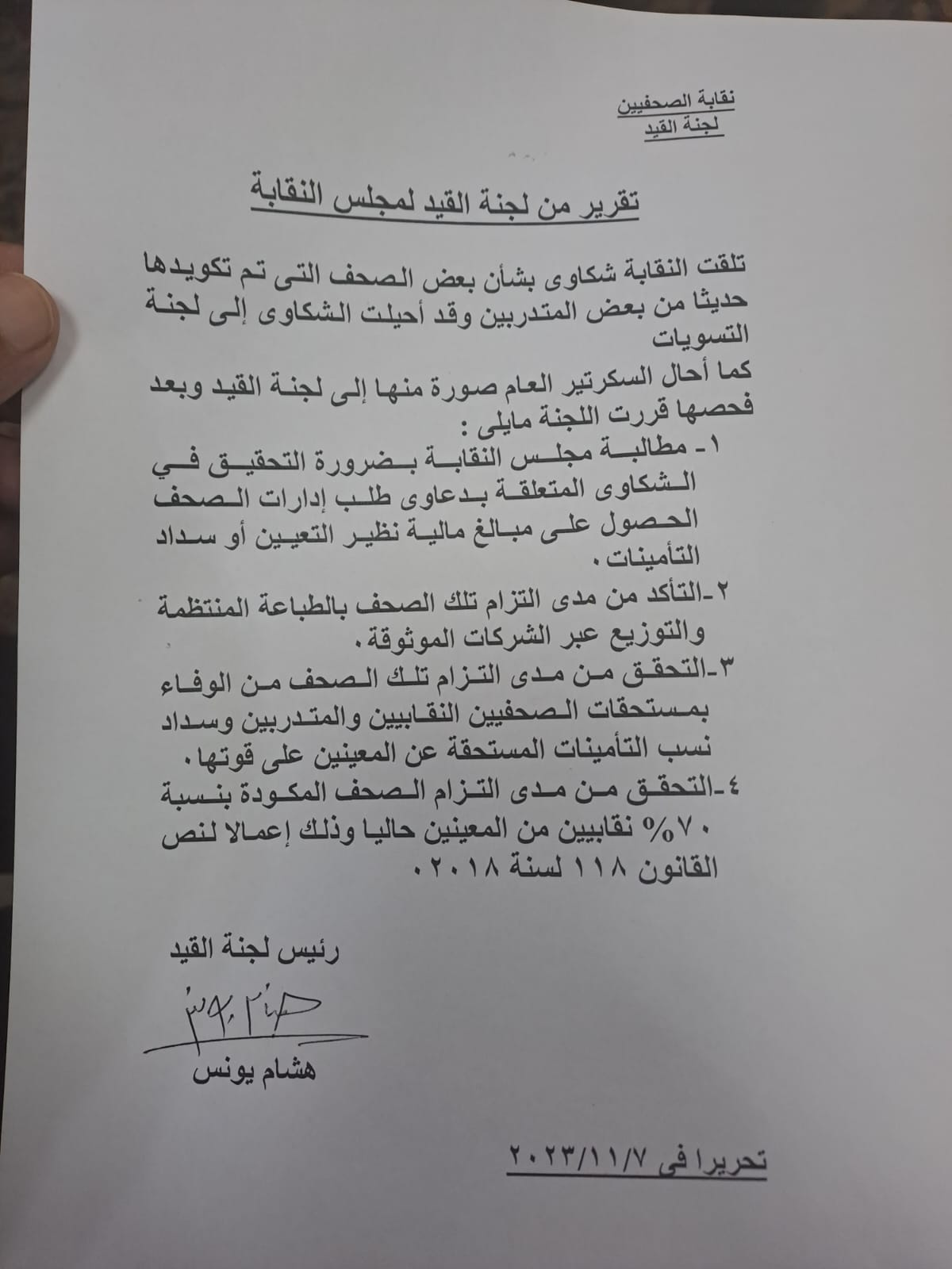 رفعت لجنة القيد بنقابة الصحفيين، برئاسة هشام يونس، تقريرًا يتضمن شكاوى التي تلقتها النقابة بشأن بعض الصحف التي تم تكويدها حديثا من بعض المتدربين وقد أحيلت الشكاوى إلى لجنة التسويات.