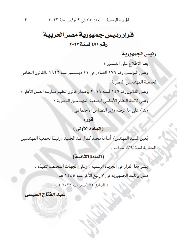 -قرار جمهوري رقم 491 لسنة 2023، تعيين المهندس أسامة محمد كمال عبد الحميد، رئيسا لجمعية المهندسين المصرية لمدة ثلاث سنوات.
