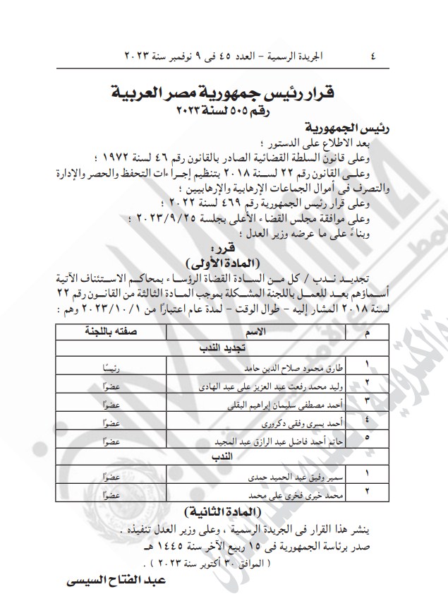 نشرت الجريدة الرسمية في عددها رقم 45، الصادر في 9 نوفمبر 2023، قرارين جمهوريين للرئيس عبد الفتاح السيسي، بشأن تعيين مهندس أحمد كمال رئيسًا لجمعية المهندسين، وتجديد ندب 7 قضاة رؤساء بمحاكم الاستئناف بلجنة تنظيم إجراءات التحفظ والحصر والإدارة والتصرف في أموال الجماعات الإرهابية.