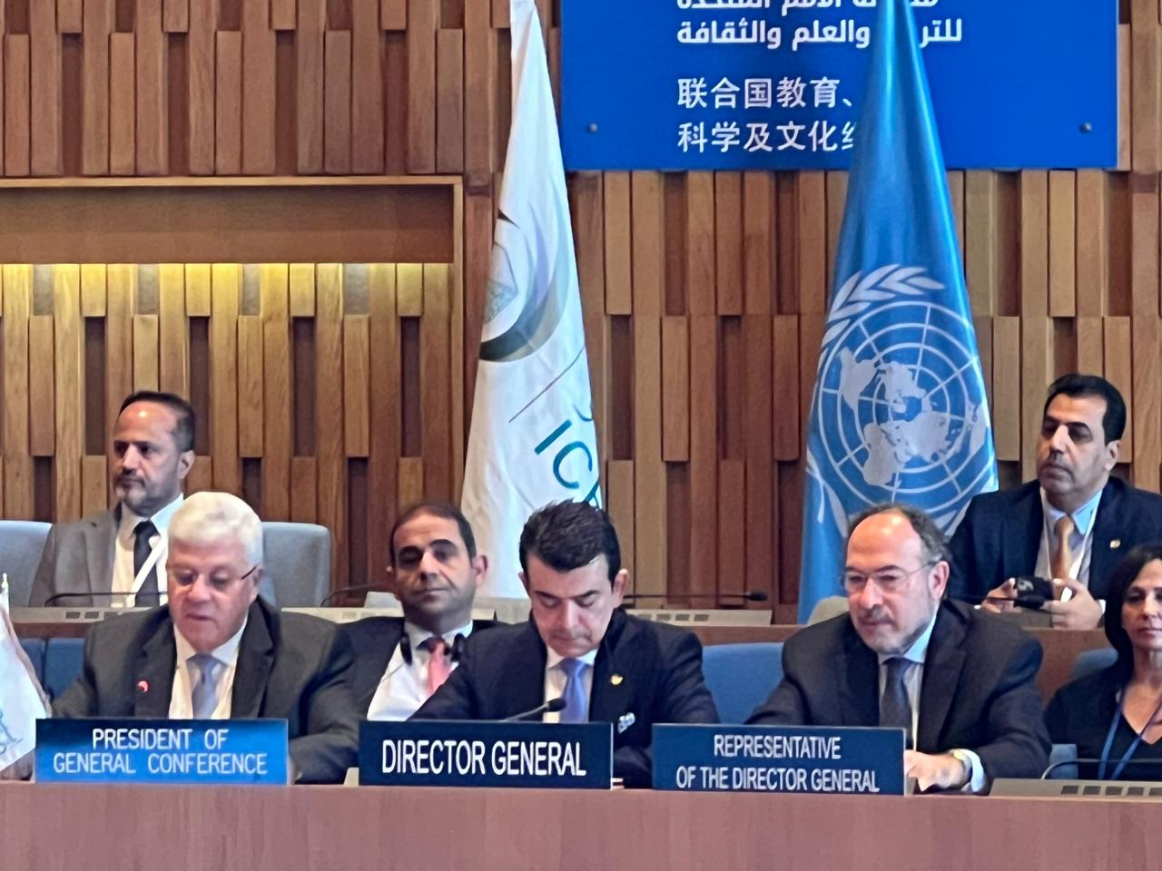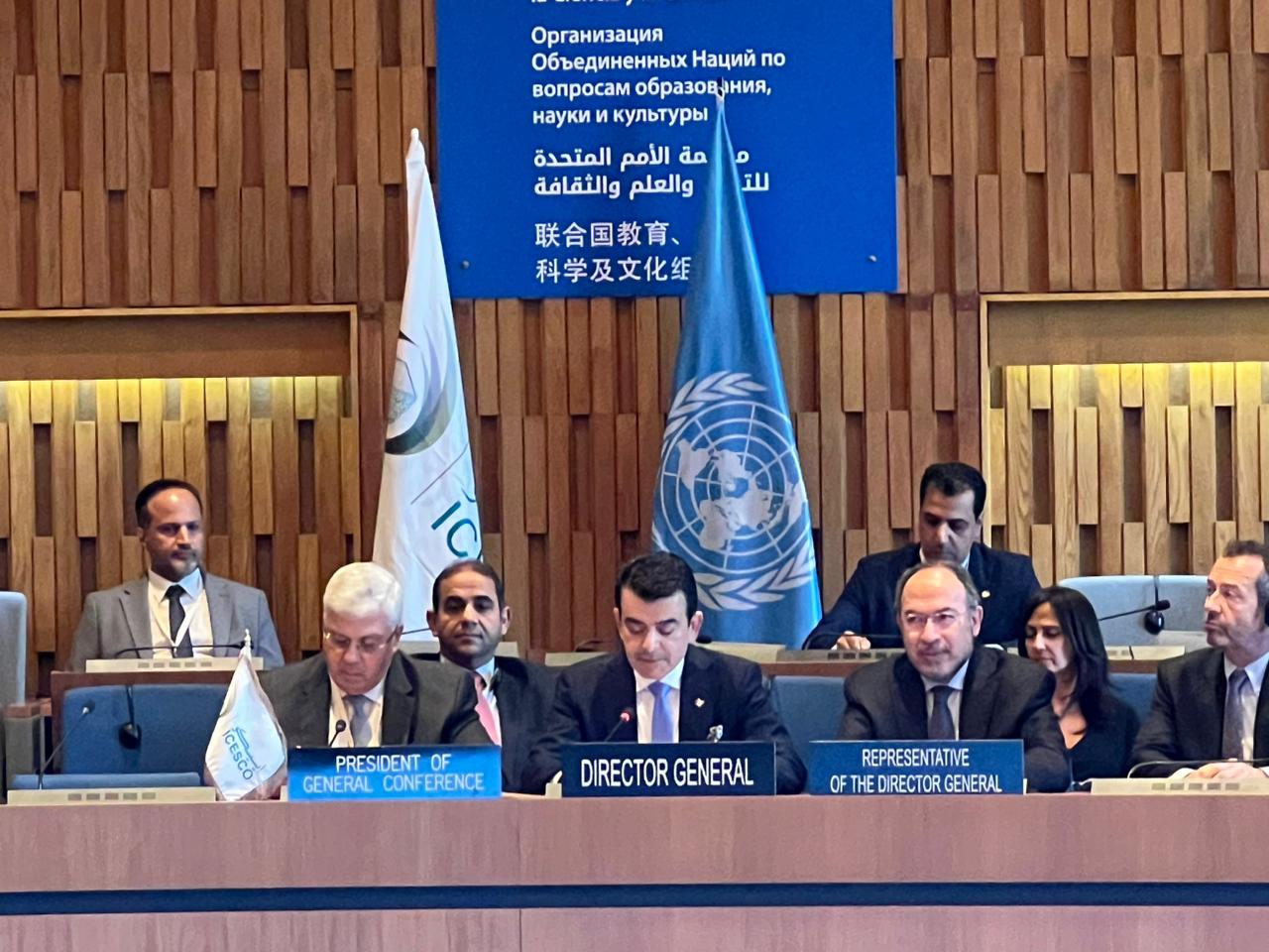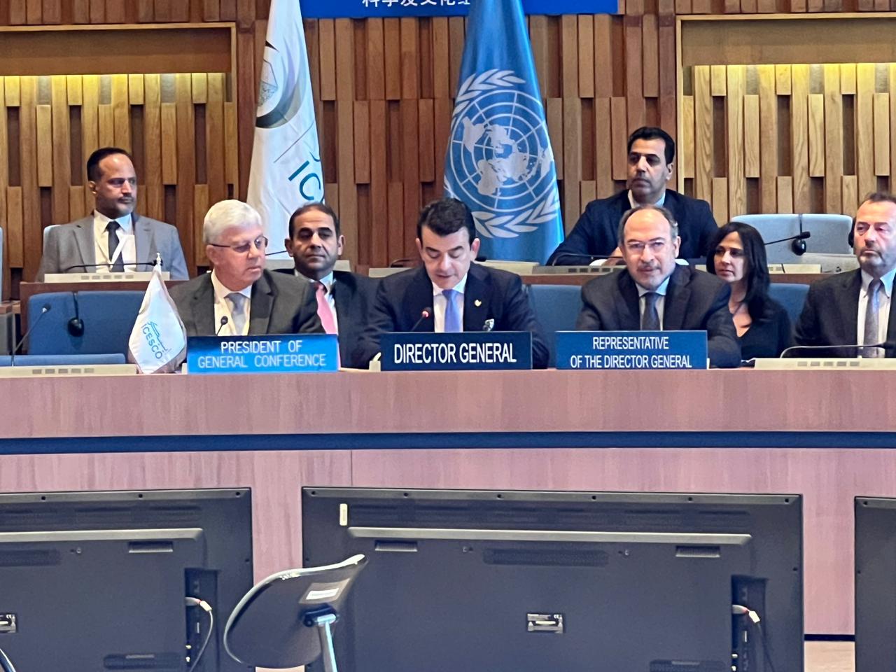 وأشار د. عاشور إلى أن جمهورية مصر العربية تولي اهتمامًا بالغًا لتفعيل الأولوية العامة لدول المجموعة العربية، مؤكدًا على الدور الرائد والفاعل للمجموعة العربية بمنظمة اليونسكو، على الرغم من عدم شغل أي مسئول من المجموعة العربية منصب مدير عام منظمة اليونسكو منذ إنشائها عام ۱۹٤٥، على الرغم من أن الكثير منها تعُد من الدول المؤسسة للمنظمة، مضيفًا أن جمهورية مصر العربية قد تولت من قبل رئاسة المجلس التنفيذي لمنظمة اليونسكو مرتين مما أسهم في رسم الصورة الطيبة عن مصر في أروقة اليونسكو، باعتباره المحفل الفكري لمنظومة الأمم المتحدة، وعلى الرغم من عدم التوفيق الذي صادف الترشيح العربي عام ۱۹۹۹ وعام ۲۰۰۹، فقد قامت مصر بالإعلان عن ترشيح الدكتور خالد العناني، وزير السياحة والآثار السابق لمنصب مدير عام منظمة الأمم المتحدة للتربية والعلوم والثقافة (اليونسكو) للفترة من ٢٠٢٥ إلى ۲۰۲۹، لما له من خبرة كبيرة وواسعة في مجال الحفاظ على التراث وعلم المصريات، معربًا عن آماله بتكاتف جميع الدول العربية والإسلامية في دعم مرشح جمهورية مصر العربية ليصبح منافسًا قويًا لباقي المرشحين ممثلًا عن المجموعة العربية، مؤكدًا أن جمهورية مصر العربية توظف ذلك لصالح تحقيق التوافق، وطرح ودعم مبادرات للمنظمة في مجالات عملها بما يفعل من دورها في شتى أرجاء العالم، ولاسيما الدول النامية.