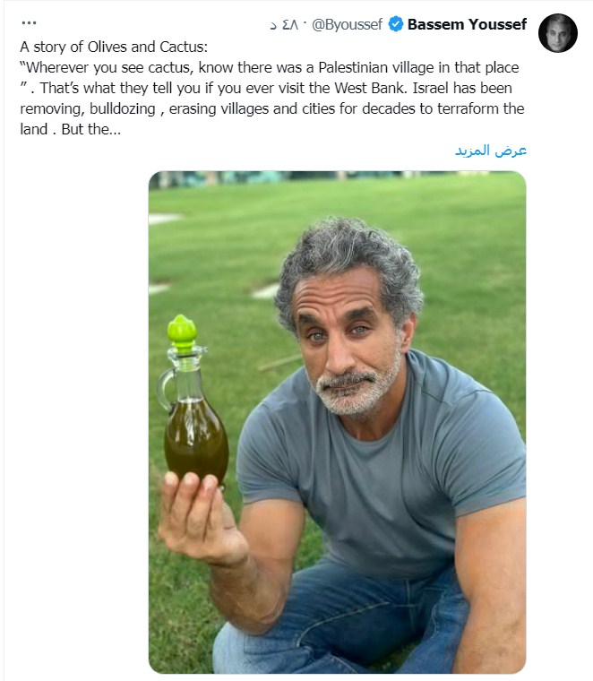 وعن قصة الزيتون وأرض فلسطين قال باسم يوسف: "لقد عادت إحدى صديقاتي للتو من هناك وهي تحمل هدية لي: زيت زيتون معصور محليًا من قريتها في الضفة الغربية. "انسى الأشياء التجارية التي تشتريها من المتاجر. نحن نعصر النفط في قرانا."