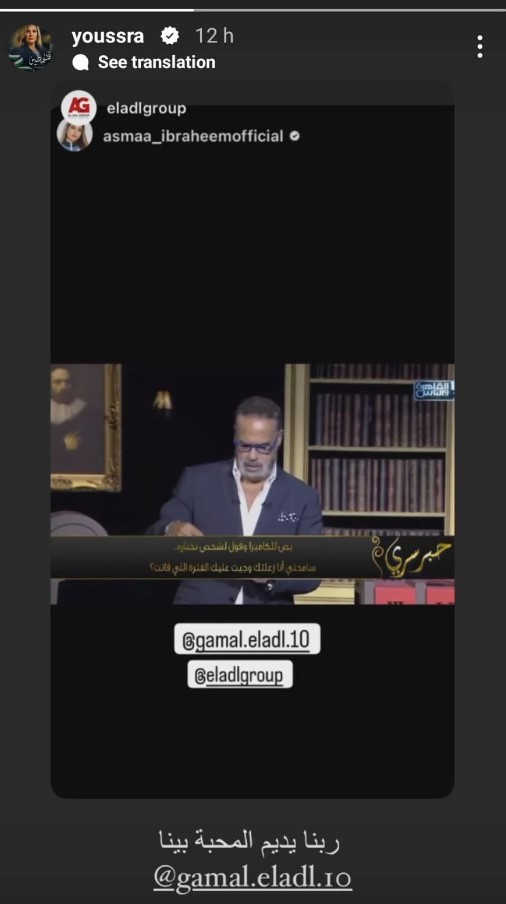 وأعادت يسرا نشر اعتذار المنتج جمال العدل، عبر ستوري حسابها الشخصي بموقع تبادل الصور والفيديوهات إنستجرام، وعلقت: ربنا يديم المحبة بينا.