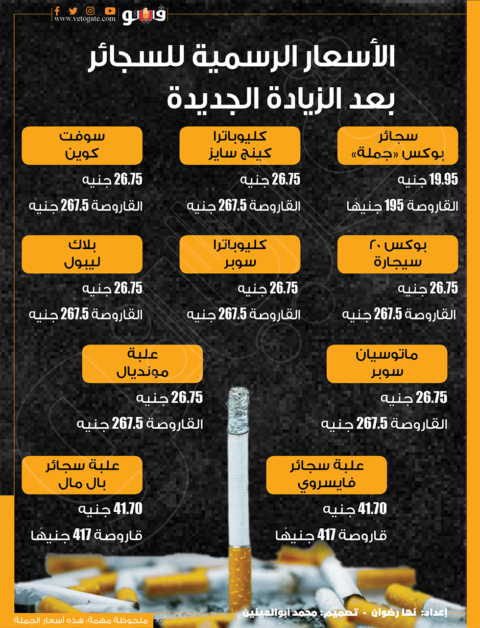 الأسعار الرسمية للسجائر بعد الزيادة الجديدة (إنفوجراف) الجمعة 10/نوفمبر/2023 - 08:53 م 11/10/2023 8:53:52 PM أسعار السجائر الجملة في الأسواق، فيتو نها رضوان شارك طباعة 18 حجم الخط شارك طباعة أسعار السجائر أسعار الجملة الشرقية للدخان الشركة الشرقية للدخان الشركة الشرقية سجائر فايسروي سجائر البوكس سعر القاروص شركة الشرقية شركة الشرقية للدخان علبة سجائر علبة السجائر