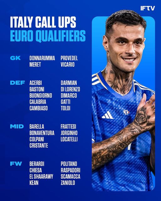 أعلن لوتشيانو سباليتي، المدير الفني لمنتخب إيطاليا، عن قائمة فريقه استعدادا لخوض مبارتين في التصفيات المؤهلة لبطولة أمم أوروبا يورو 2024 والتي ستقام في ألمانيا.
