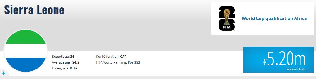 - بلغت القيمة التسويقية لمنتخب سيراليون 5 ملايين و200 ألف يورو.
