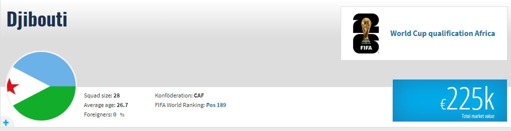 - بلغت القيمة التسويقية لمنتخب جيبوتي 225 ألف يورو.
