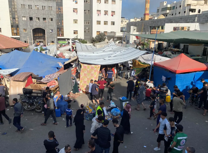 كما يحتمي آلاف النازحين من سكان غزة بخيام مصنوعة من القماش في مرآب سيارات المستشفى وينامون في الممرات أو على الدرج ويقضون ساعات اليوم على سلالم المستشفى وينشرون الغسيل على الأسطح دون أن يتركوا أي مساحة خالية داخل المنشأة الطبية.