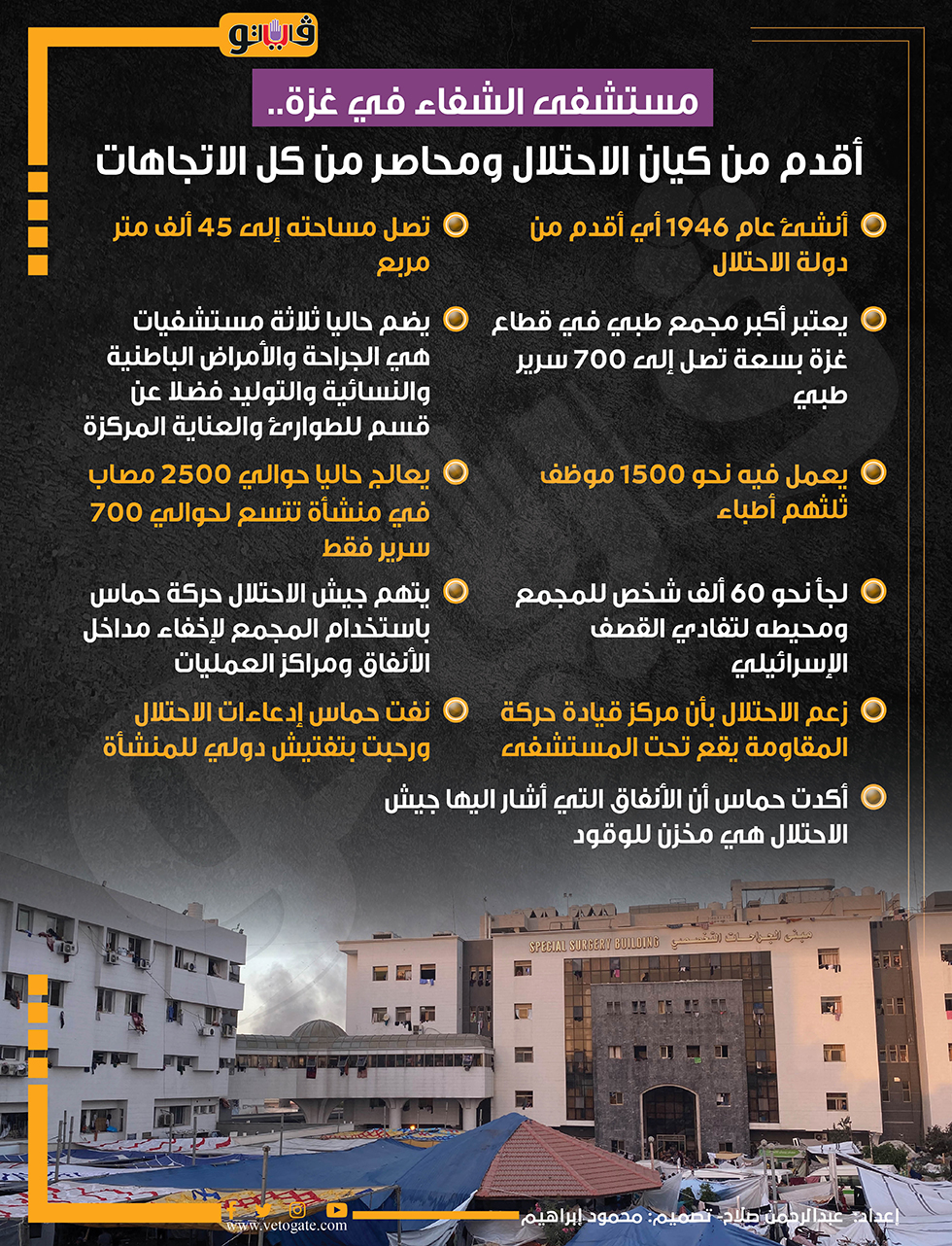 مستشفى الشفاء في غزة.. أقدم من كيان الاحتلال ومحاصر من كل الاتجاهات (انفوجراف) السبت 11/نوفمبر/2023 - 03:56 م 11/11/2023 3:56:52 PM مستشفي الشفاء، فيتو عبدالرحمن صلاح شارك طباعة 18 حجم الخط شارك طباعة مستشفى الشفاء مستشفي الشفاء في قطاع غزة جيش الاحتلال الاحتلال الإسرائيلي طوفان الأقصى حماس