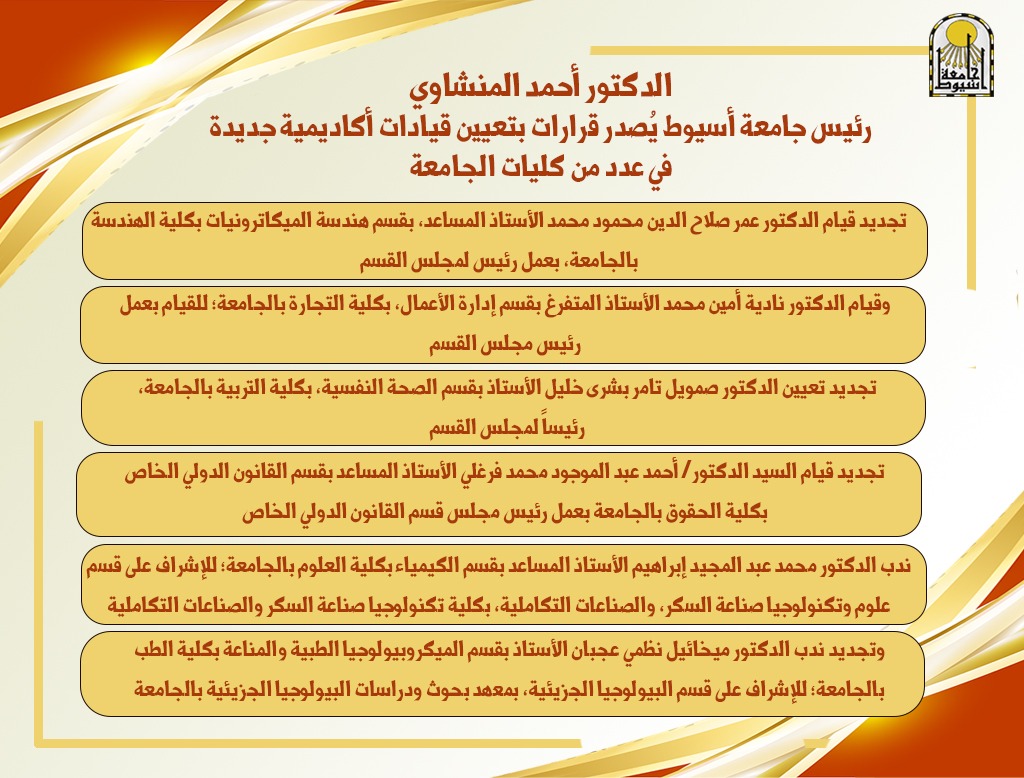 وتضمنت قرارات رئيس جامعة أسيوط؛ تجديد قيام الدكتور عمر صلاح الدين محمود محمد الأستاذ المساعد، بقسم هندسة الميكاترونيات بكلية الهندسة بالجامعة، بعمل رئيس لمجلس القسم، وقيام الدكتور نادية أمين محمد الأستاذ المتفرغ بقسم إدارة الأعمال، بكلية التجارة بالجامعة؛ للقيام بعمل رئيس مجلس القسم.