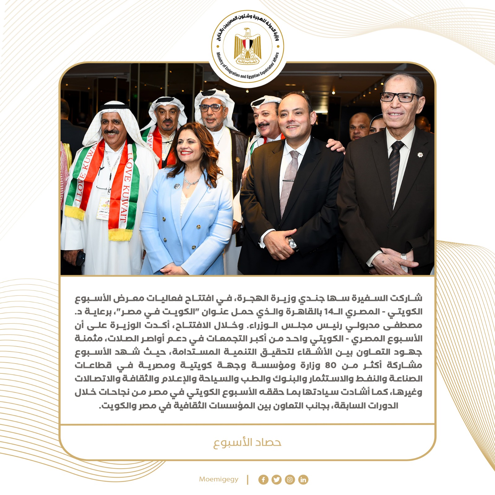 4- شاركت السفيرة سها جندي وزيرة الهجرة، في افتتاح فعاليات معرض الأسبوع الكويتي - المصري الـ14 بالقاهرة والذي حمل عنوان "الكويت في مصر"، برعاية د. مصطفى مدبولي رئيس مجلس الوزراء. وخلال الافتتاح، أكدت الوزيرة على أن الأسبوع المصري - الكويتي واحد من أكبر التجمعات في دعم أواصر الصلات، مثمنة جهود التعاون بين الأشقاء لتحقيق التنمية المستدامة، حيث شهد الأسبوع مشاركة أكثر من 80 وزارة ومؤسسة وجهة كويتية ومصرية في قطاعات الصناعة والنفط والاستثمار والبنوك والطب والسياحة والإعلام والثقافة والاتصالات وغيرها، كما أشادت بما حققه الأسبوع الكويتي في مصر من نجاحات خلال الدورات السابقة، بجانب التعاون بين المؤسسات الثقافية في مصر والكويت.