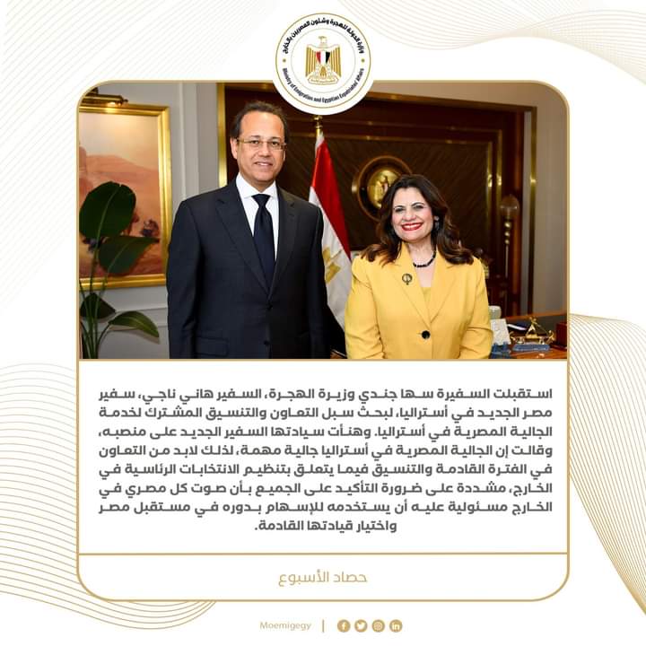 6- استقبلت السفيرة سها جندي وزيرة الهجرة، السفير هاني ناجي، سفير مصر الجديد في أستراليا، لبحث سبل التعاون والتنسيق المشترك لخدمة الجالية المصرية في أستراليا. وهنأت السفير الجديد على منصبه، وقالت إن الجالية المصرية في أستراليا جالية مهمة، لذلك لابد من التعاون في الفترة القادمة والتنسيق فيما يتعلق بتنظيم الانتخابات الرئاسية في الخارج، مشددة على ضرورة التأكيد على الجميع بأن صوت كل مصري في الخارج مسئولية عليه أن يستخدمه للإسهام بدوره في مستقبل مصر واختيار قيادتها القادمة.