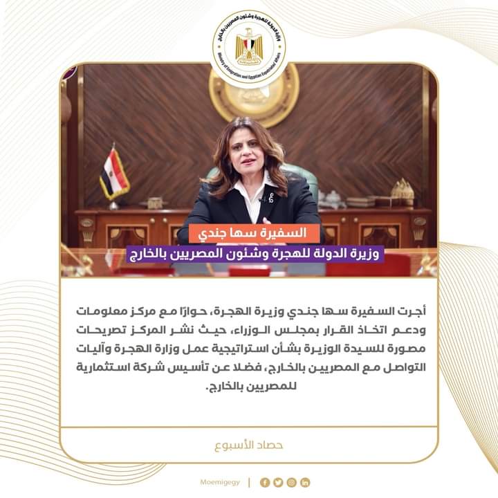 9- أجرت السفيرة سها جندي وزيرة الهجرة، حوارًا مع مركز معلومات ودعم اتخاذ القرار بمجلس الوزراء، حيث نشر المركز تصريحات مصورة للوزيرة بشأن استراتيجية عمل وزارة الهجرة وآليات التواصل مع المصريين بالخارج، فضلا عن تأسيس شركة استثمارية للمصريين بالخارج.