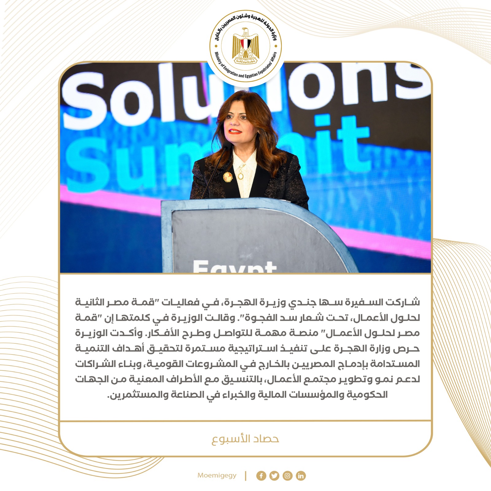 2- شاركت السفيرة سها جندي وزيرة الهجرة، في فعاليات "قمة مصر الثانية لحلول الأعمال، تحت شعار سد الفجوة". وقالت الوزيرة في كلمتها إن "قمة مصر لحلول الأعمال" منصة مهمة للتواصل وطرح الأفكار. وأكدت الوزيرة حرص وزارة الهجرة على تنفيذ استراتيجية مستمرة لتحقيق أهداف التنمية المستدامة بإدماج المصريين بالخارج في المشروعات القومية، وبناء الشراكات لدعم نمو وتطوير مجتمع الأعمال، بالتنسيق مع الأطراف المعنية من الجهات الحكومية والمؤسسات المالية والخبراء في الصناعة والمستثمرين.