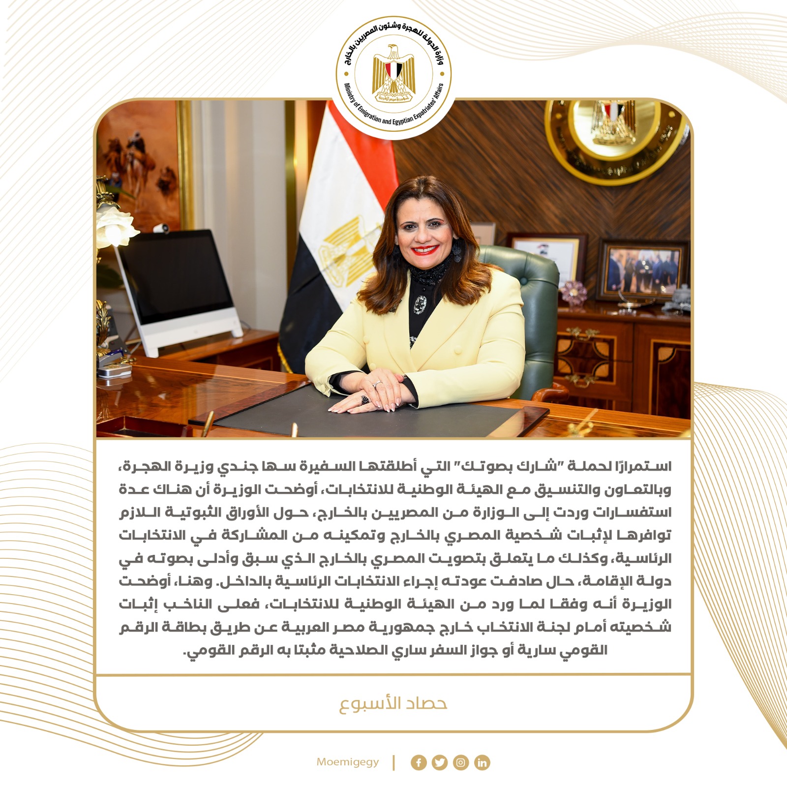 3- استمرارًا لحملة "شارك بصوتك" التي أطلقتها السفيرة سها جندي وزيرة الهجرة، وبالتعاون والتنسيق مع الهيئة الوطنية للانتخابات، أوضحت الوزيرة أن هناك عدة استفسارات وردت إلى الوزارة من المصريين بالخارج، حول الأوراق الثبوتية اللازم توافرها لإثبات شخصية المصري بالخارج وتمكينه من المشاركة في الانتخابات الرئاسية، وكذلك ما يتعلق بتصويت المصري بالخارج الذي سبق وأدلى بصوته في دولة الإقامة، حال صادفت عودته إجراء الانتخابات الرئاسية بالداخل. وهنا، أوضحت الوزيرة أنه وفقا لما ورد من الهيئة الوطنية للانتخابات، فعلى الناخب إثبات شخصيته أمام لجنة الانتخاب خارج جمهورية مصر العربية عن طريق بطاقة الرقم القومي سارية أو جواز السفر ساري الصلاحية مثبتا به الرقم القومي.