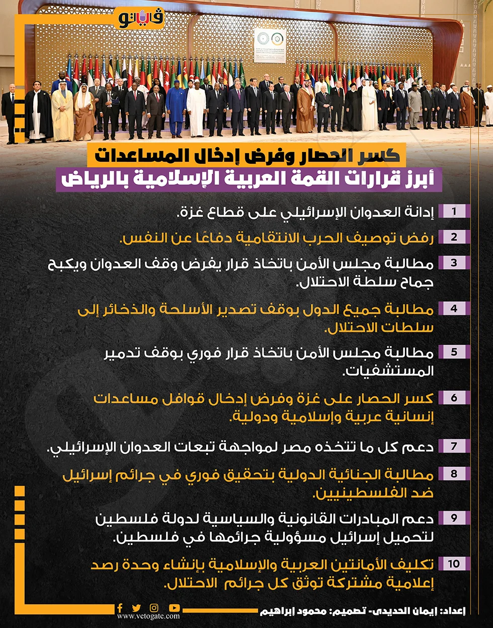 وطالب البيان الختامي للقمة العربية الإسلامية مجلس الأمن اتخاذ قرار حاسم ملزم يفرض وقف العدوان ويكبح جماح سلطة الاحتلال الاستعماري التي تنتهك القانون الدولي، والقانون الدولي الإنساني وقرارات الشرعية الدولية، وآخرها قرار الجمعية العامة للأمم المتحدة رقم A/ES-10/L.25 بتاريخ 26/10/ 2023، واعتبار التقاعس عن ذلك تواطؤا يتيح لإسرائيل الاستمرار في عدوانها الوحشي الذي يقتل الأبرياء، أطفالا وشيوخا ونساء ويحيل غزة خرابا.