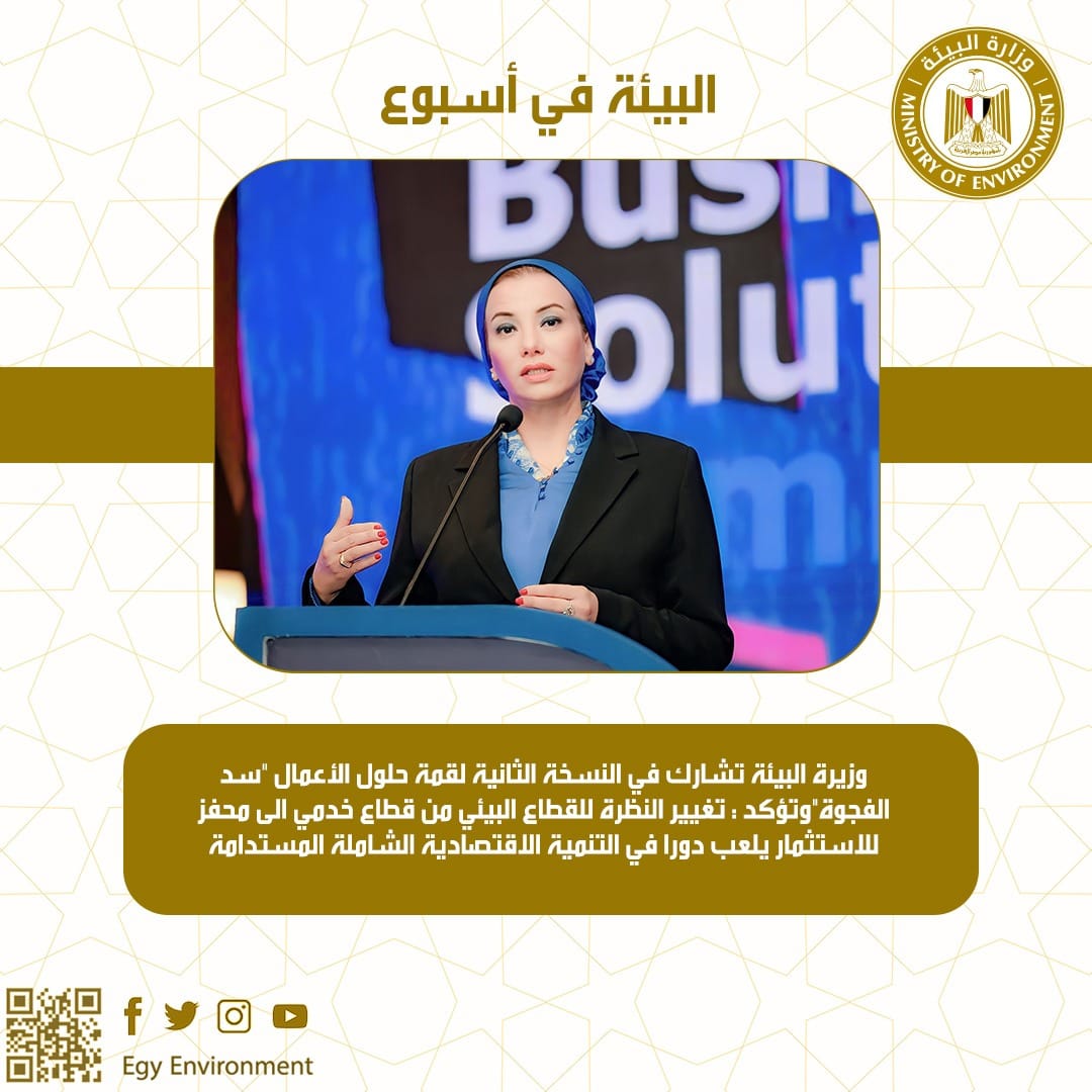 شاركت الدكتورة ياسمين فؤاد وزيرة البيئة، في النسخة الثانية للقمة السنوية لحلول الأعمال تحت عنوان "سد الفجوة"، بحضور السفيرة سها الجندي وزيرة الدولة للهجرة وشئون المصريين بالخارج، وعدد من ممثلي الحكومة والقطاع الخاص والمصرفي ورواد الأعمال، حيث أشارت وزيرة البيئة إلى أهمية القمة في التركيز على سد الفجوات الإجرائية والمصرفية والتشريعية والتقنية وتقديم المبادرات المختلفة للدفع بالمشروعات الصغيرة والمتوسطة لدفع الاقتصاد المصري والناتج المحلي، موضحة أن وزارة البيئة تضع في مقدمة أولوياتها دعم الاستثمار البيئي وتذليل العقبات أمام المستثمرين لتشجيعهم على الانخراط في مزيد من الاستثمارات الخضراء، لتعزيز مسار مصر نحو التحول الأخضر.