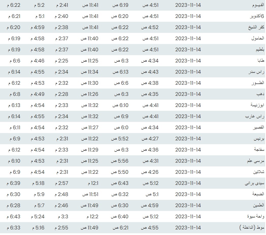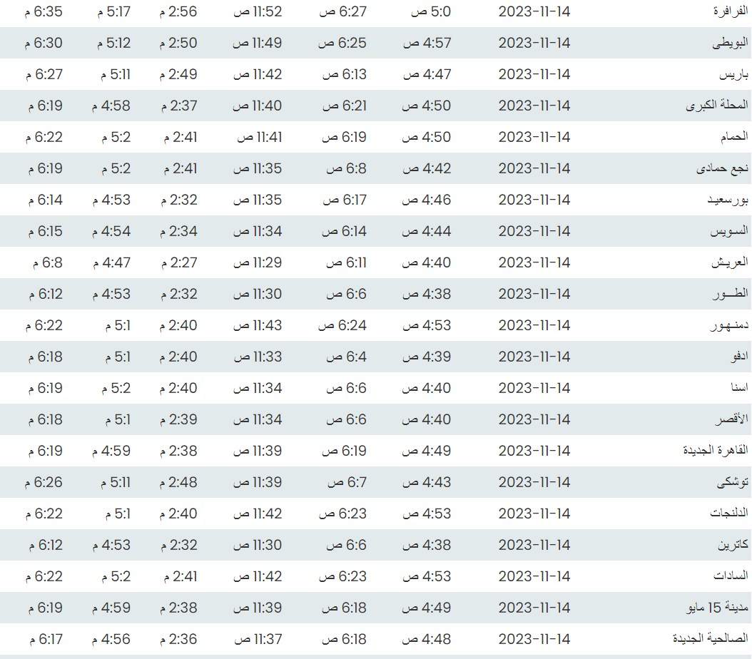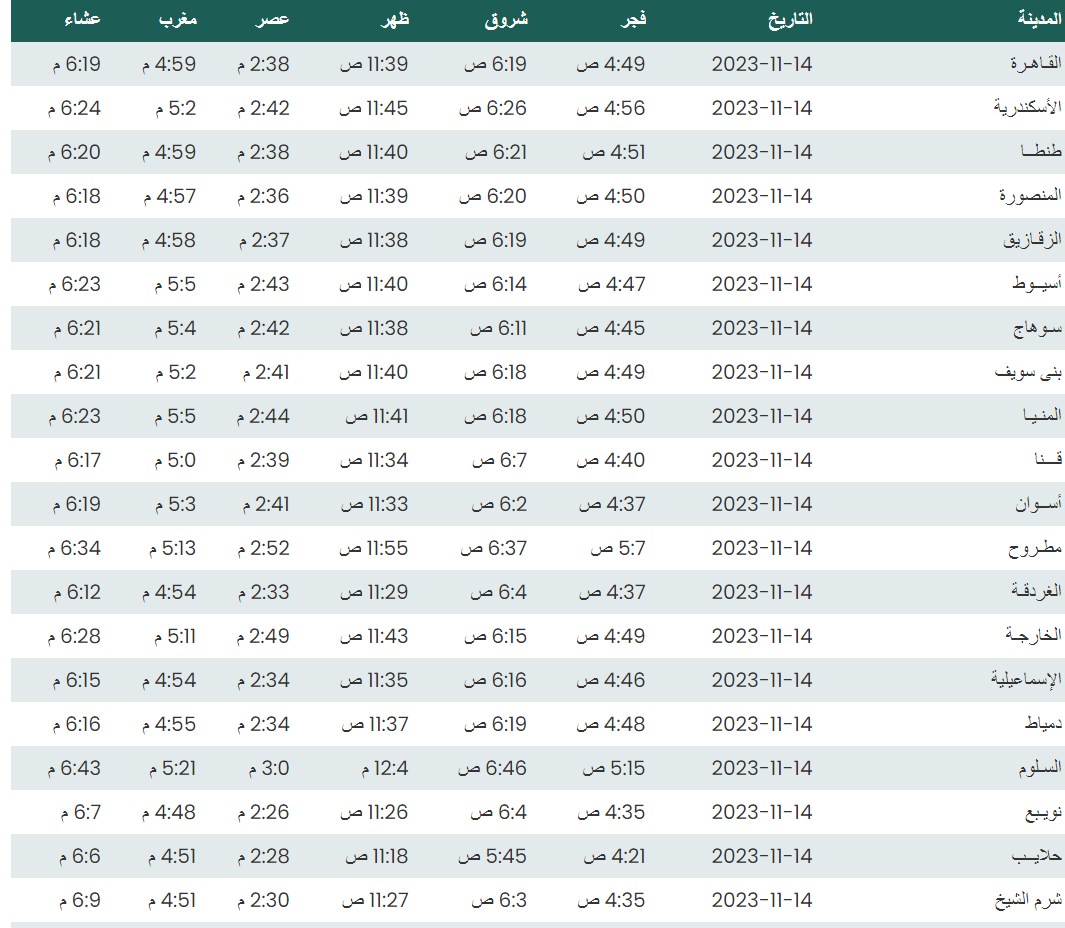 مواقيت الصلاة اليوم وفقًا للتوقيت المحلي لمدينتي القاهرة والإسكندرية وكذلك،مواقيت الصلاة، لعدد من مدن ومحافظات الجمهورية من واقع بيانات الهيئة العامة للمساحة