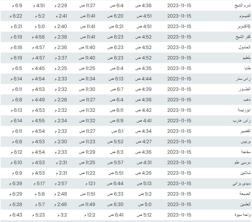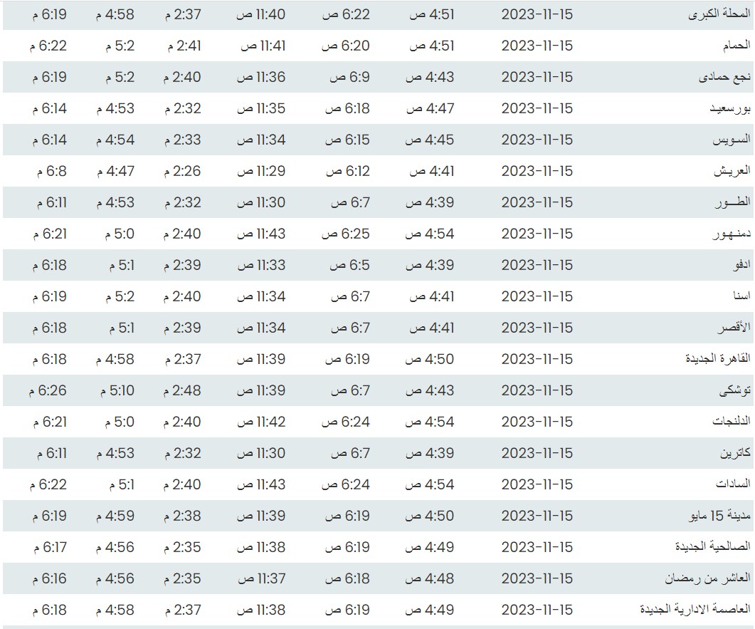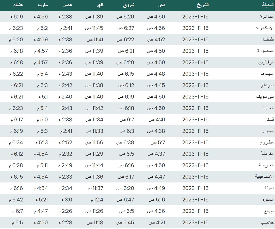 مواقيت الصلاة اليوم وفقًا للتوقيت المحلي لمدينتي القاهرة والإسكندرية وكذلك،مواقيت الصلاة، لعدد من مدن ومحافظات الجمهورية من واقع بيانات الهيئة العامة للمساحة