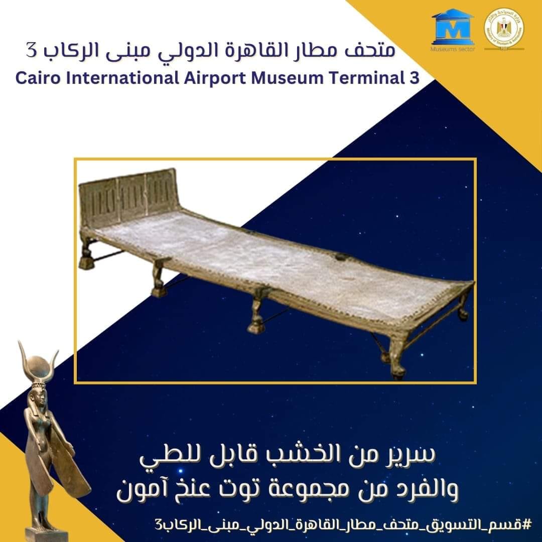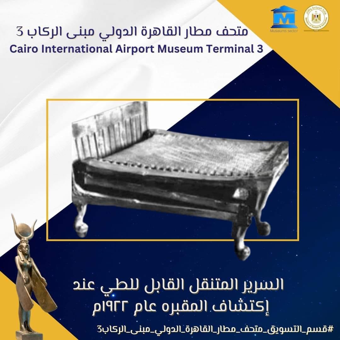 وقالت الصفحة الرسمية لقطاع المتاحف، إن عالم الآثار الإنجليزي هيوارد كارتر عثر أثناء اكتشاف مقبرة "توت عنخ آمون" عام ١٩٢٢م على أشياء فريدة من نوعها لايصدقها العقل البشري، حيث وجد أكثر من ٥٣٠٠ قطعة أثرية متنوعة ومنها "سرير متنقل" يتم طيه وفرده وهو سرير خشبي طوله حوالي 180 سم، كان يستعمله الملك في السفر ورحلات الصيد كمقعد أو كسرير يضجع عليه، ويتكون من ثلاثة أجزاء مطوية على شكل حرف Z ومثبت بعضها إلى بعض بنظام فني مبتكر من مفاصل نحاسية.