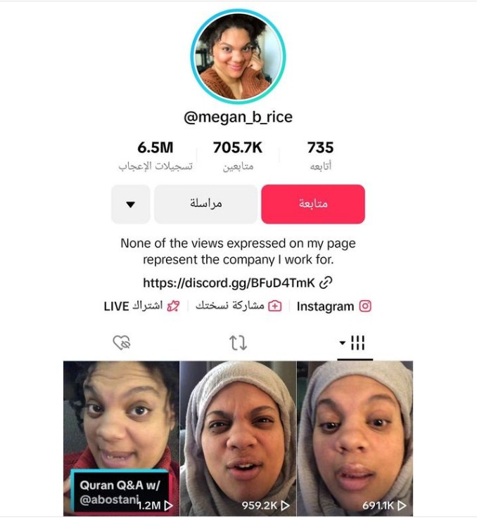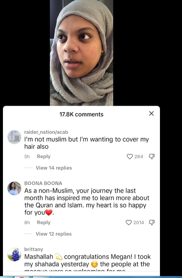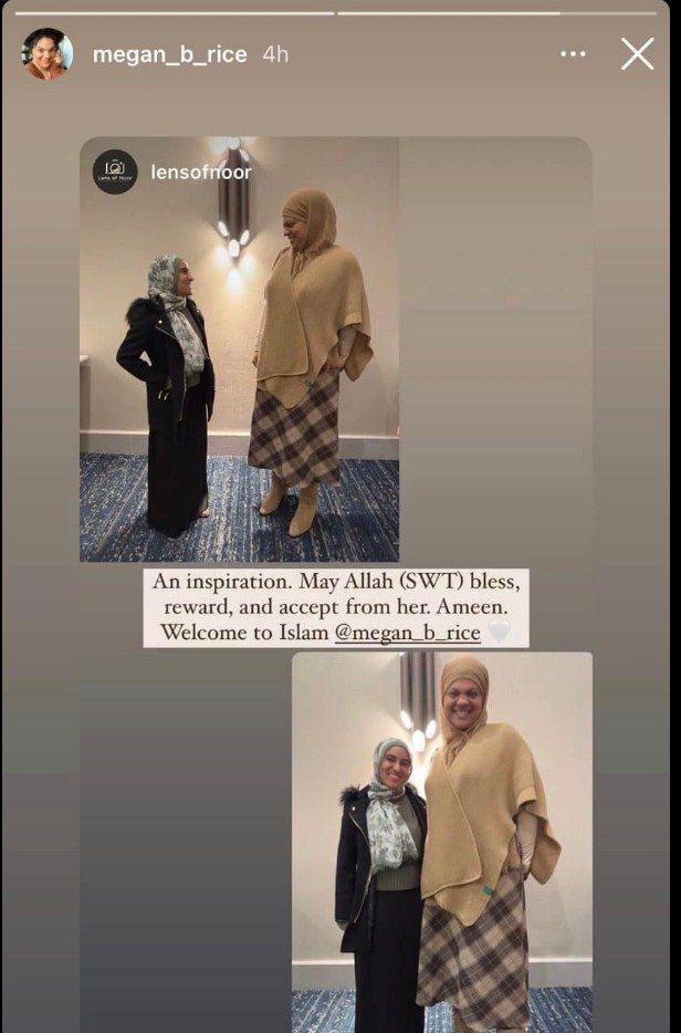وبعد ذلك ظهرت ميجان رايس في فيديو على "تيكتوك"، وهي ترتدي الحجاب وتنطق بالشهادة، الأمر الذي دفع الآلاف من المسلمين حول العالم للتفاعل معها.