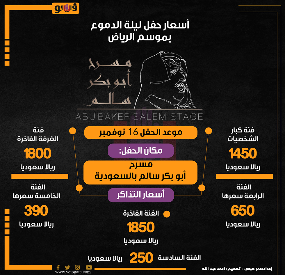 أسعار حفل ليلة الدموع بموسم الرياض (إنفوجراف) الإثنين 13/نوفمبر/2023 - 11:50 ص 11/13/2023 11:50:55 AM حفل ليلة الدموع، فيتو عمر صبحي شارك طباعة 18 حجم الخط شارك طباعة أسعار تذاكر حفل ليلة الدموع حفل ليلة الدموع تذاكر حفل ليلة الدموع